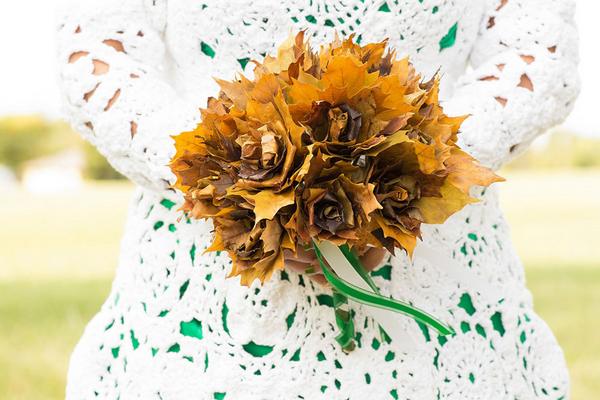Ovviamente la realizzazione stessa dell’abito da sposa ha richiesto un paziente lavoro all’uncinetto, conteggiato in circa otto mesi di integerrimo ricamo: niente, se si pensa alla gioia di Abbey per aver sfoggiato il vestito dei suoi sogni (ah, molto bello ed originale il bouquet di foglie autunnali a formare tante simil rose…).