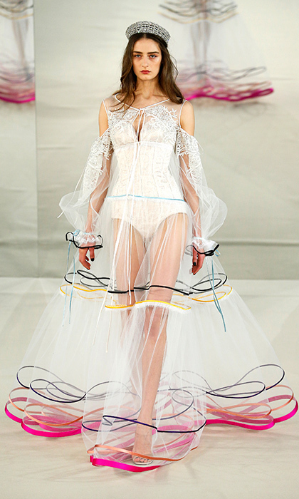 Infine, la sfilata di Viktor & Rolf, ispirata all’arte giapponese per la riparazione dei cocci di ceramica: è un gioco sofisticato di texture, colori e stampe, che culmina nel vestito da sposa in tulle bianco dai lussuosi “frammenti” in oro.