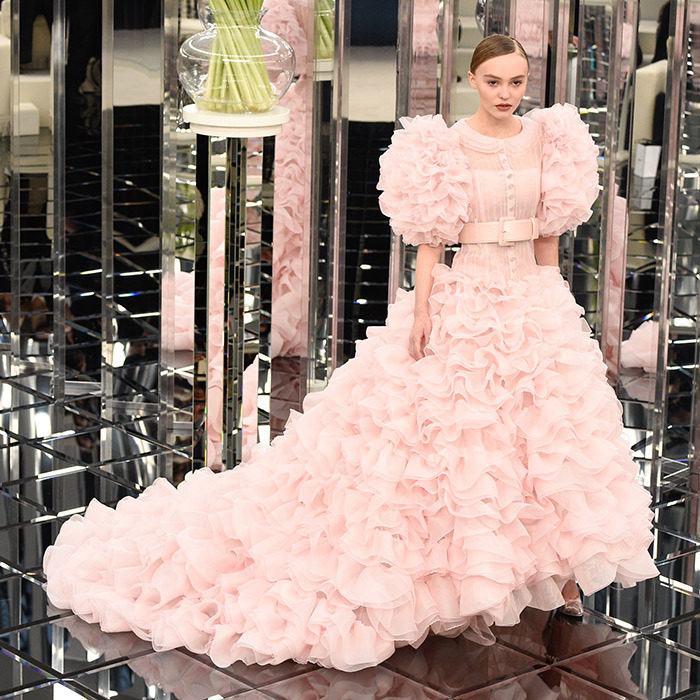E’ il caso di Chanel e dell’ingegno creativo di Karl Lagerfeld, la cui accattivante sfilata si chiude con un maestoso vestito da sposa in rosa, indossato dalla stupenda Lily-Rose Depp, in un trionfo di volume, balze e volants dall’animo assolutamente leggiadro.