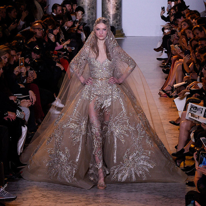 Zuhair Murad, poi, si diletta con la luce, in un crescendo di tonalità, anche dall’accento anni Ottanta, fino a concludere la sua magia d’Alta Moda con una maestosa sposa principessa, il cui abito nuziale si presenta completamente ricoperto di cristalli.