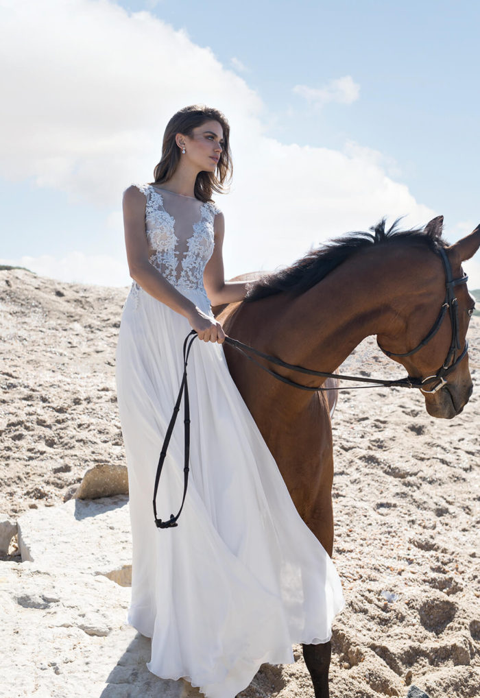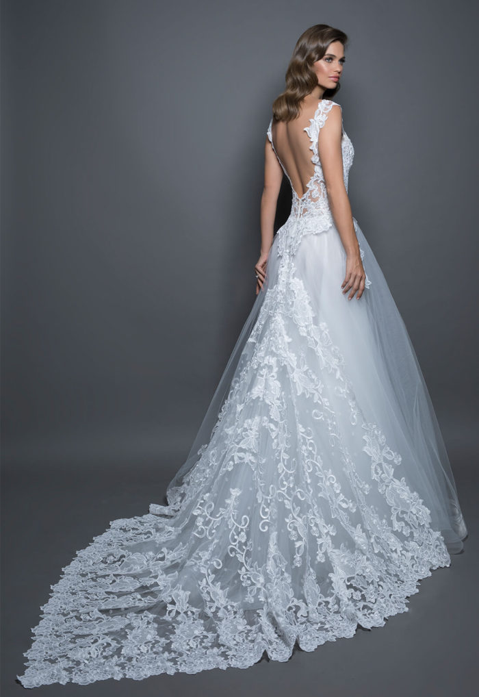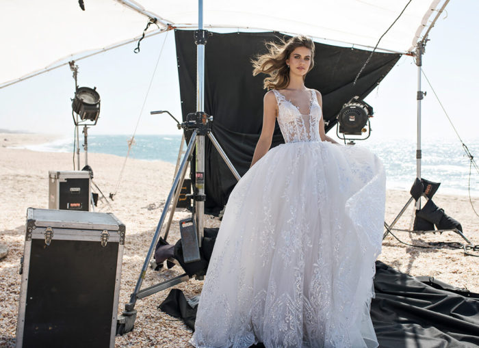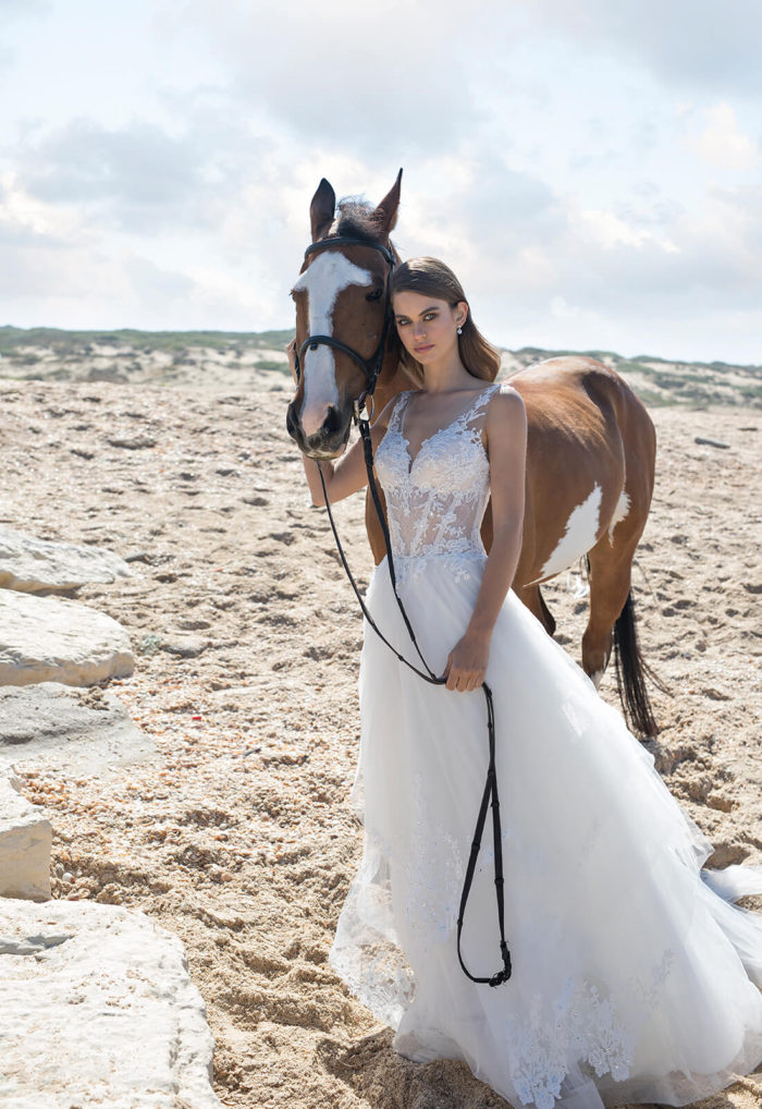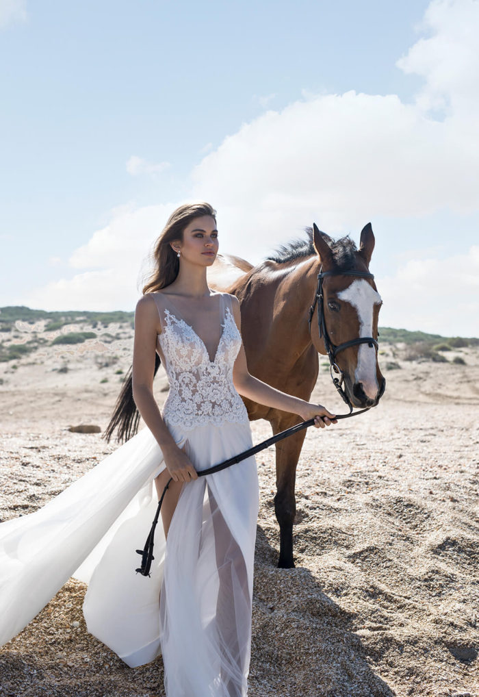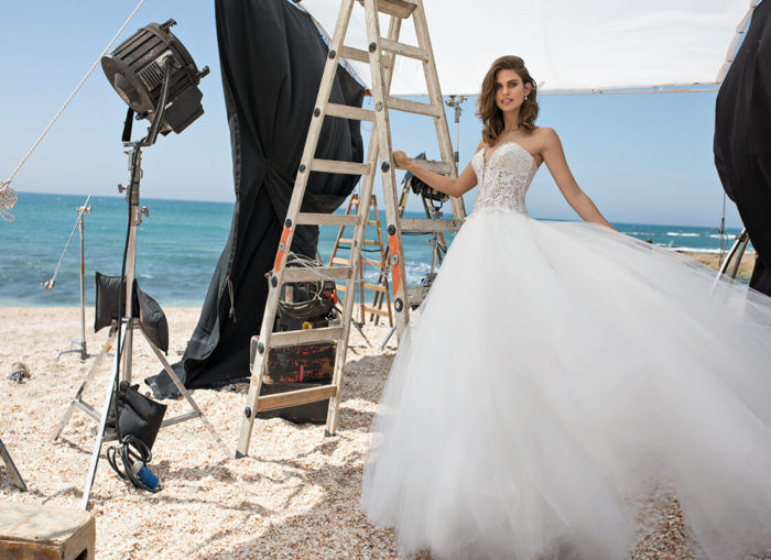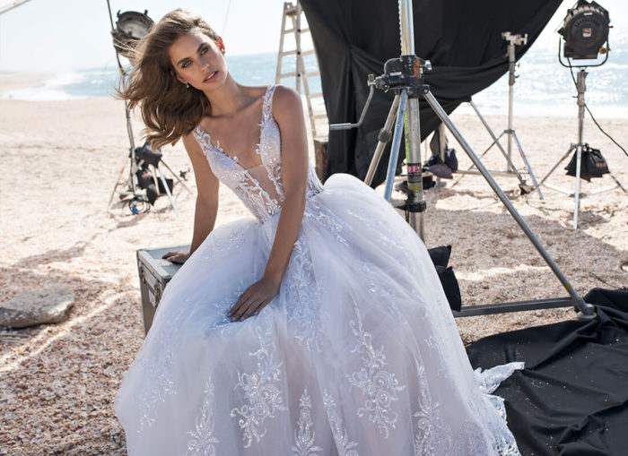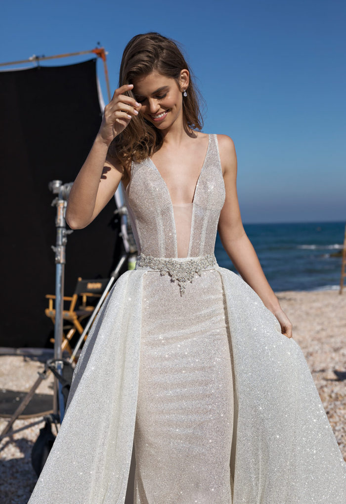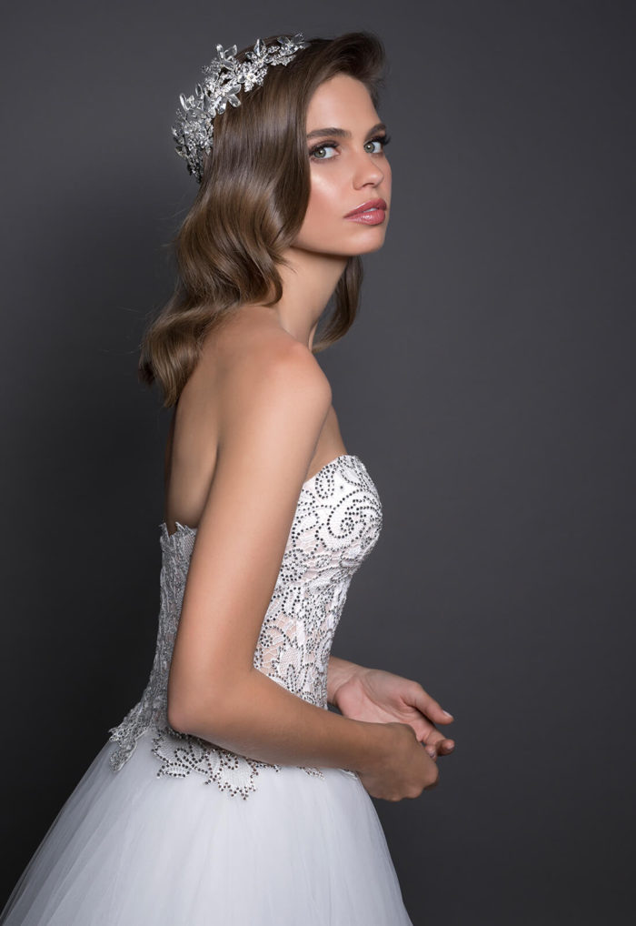 Carezze di tessuti d’alta moda scivolano languide lungo la figura, mentre si avvicendano a sontuosi modelli da principessa e tagli a sirena dalle raffinate e sensuali promesse, in un’eco di esclusiva sartorialità Made in Italy, attraverso un crescendo di ricami e lavorazioni semplicemente splendidi, da cui si evince la cura particolare per il più minimo dei dettagli.