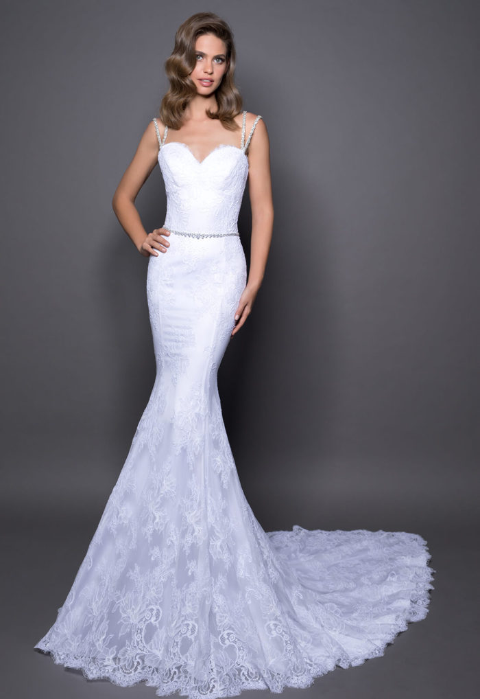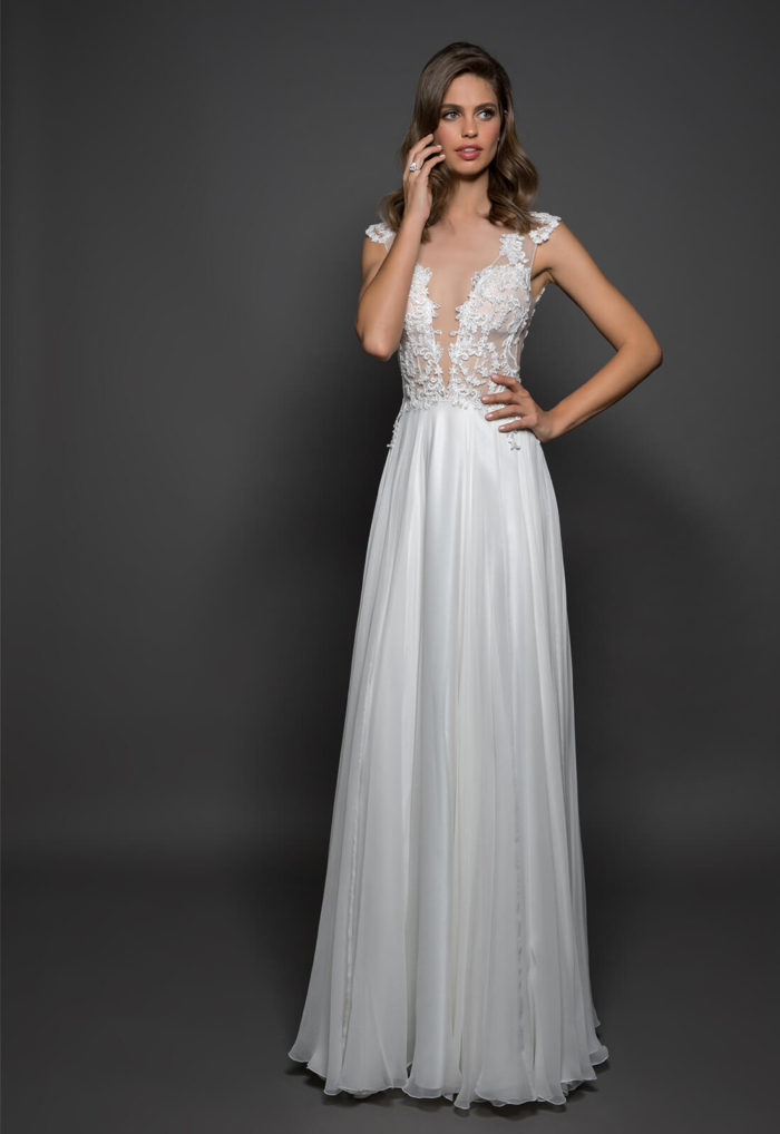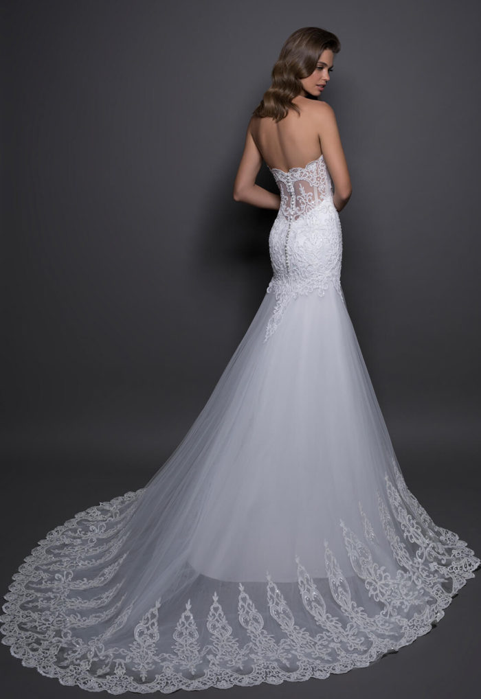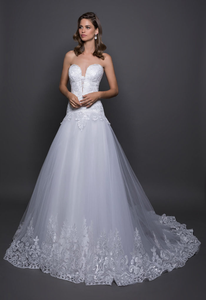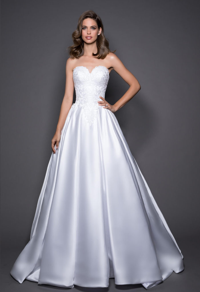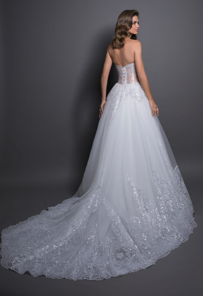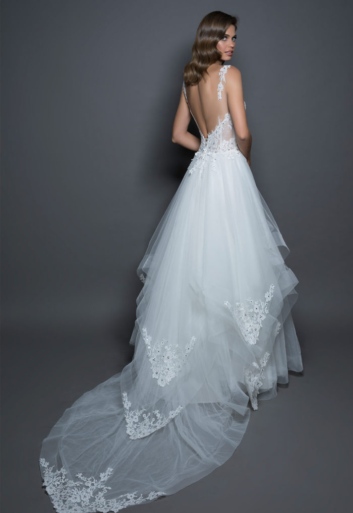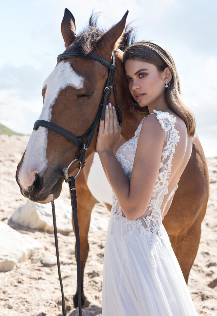 Carezze di tessuti d’alta moda scivolano languide lungo la figura, mentre si avvicendano a sontuosi modelli da principessa e tagli a sirena dalle raffinate e sensuali promesse, in un’eco di esclusiva sartorialità Made in Italy, attraverso un crescendo di ricami e lavorazioni semplicemente splendidi, da cui si evince la cura particolare per il più minimo dei dettagli.