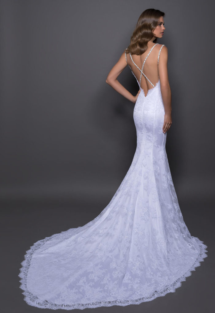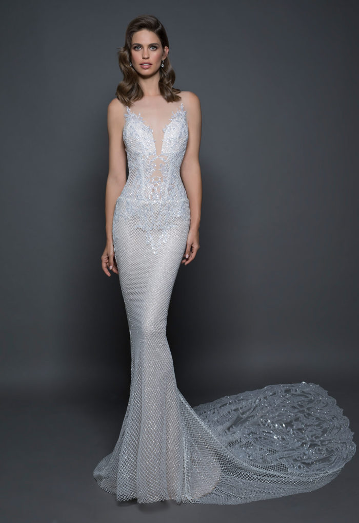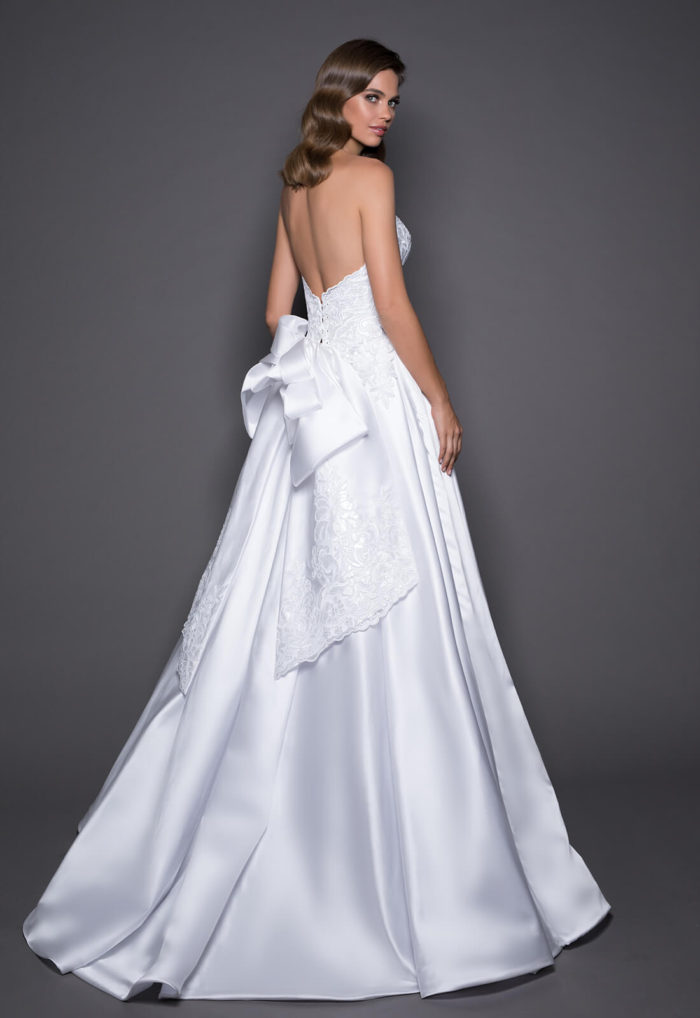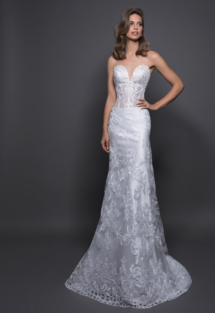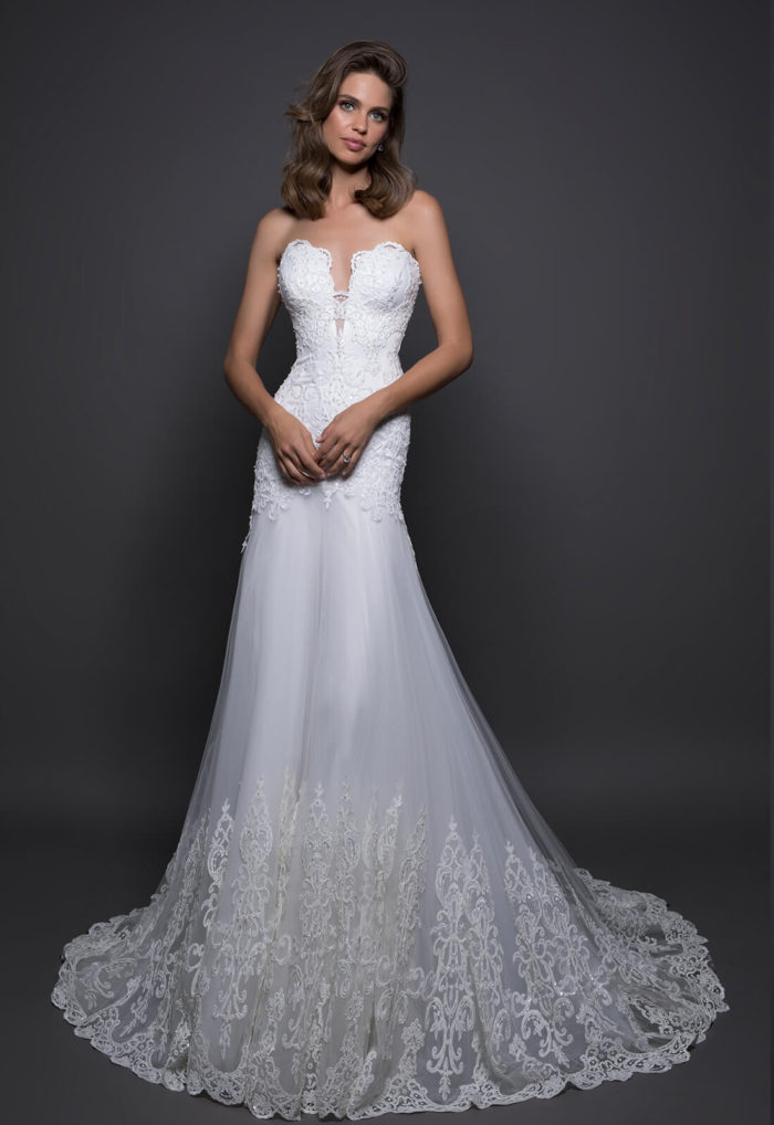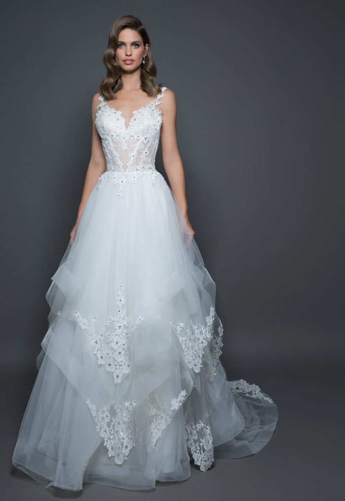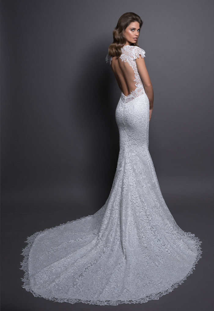 Carezze di tessuti d’alta moda scivolano languide lungo la figura, mentre si avvicendano a sontuosi modelli da principessa e tagli a sirena dalle raffinate e sensuali promesse, in un’eco di esclusiva sartorialità Made in Italy, attraverso un crescendo di ricami e lavorazioni semplicemente splendidi, da cui si evince la cura particolare per il più minimo dei dettagli.