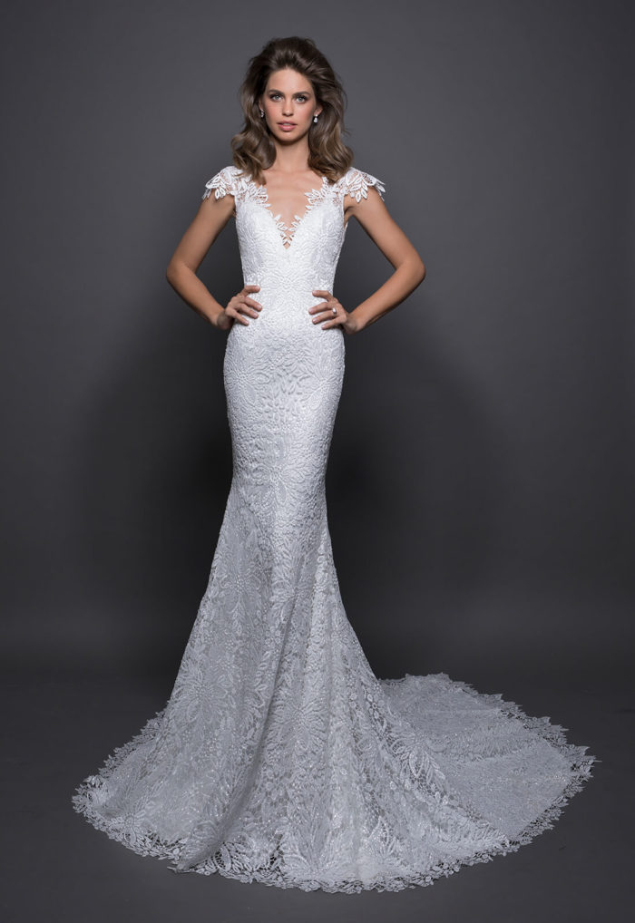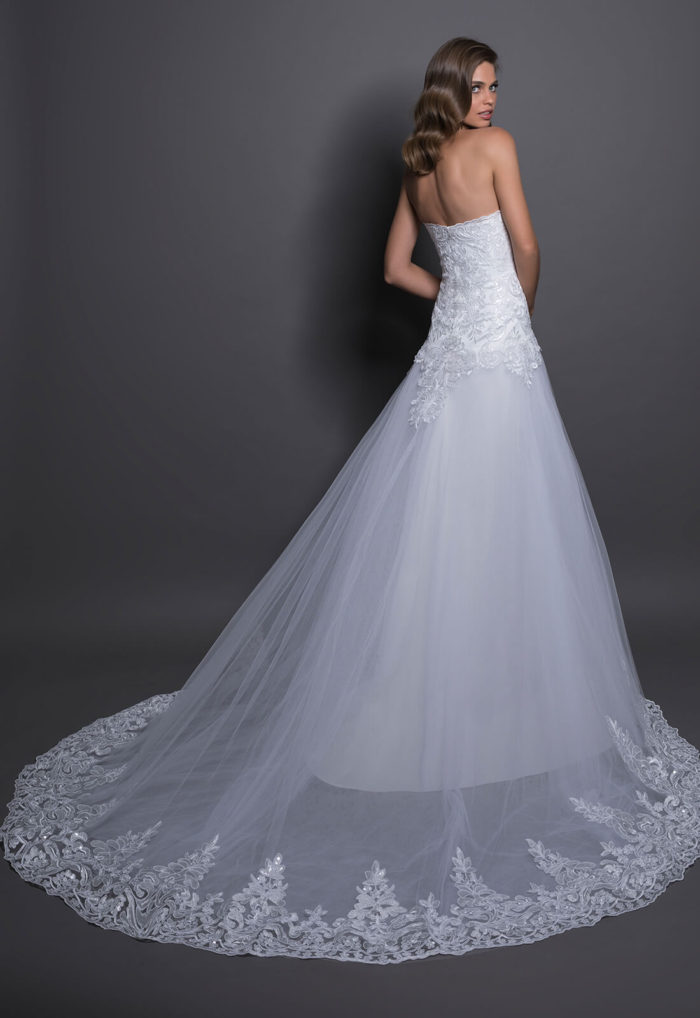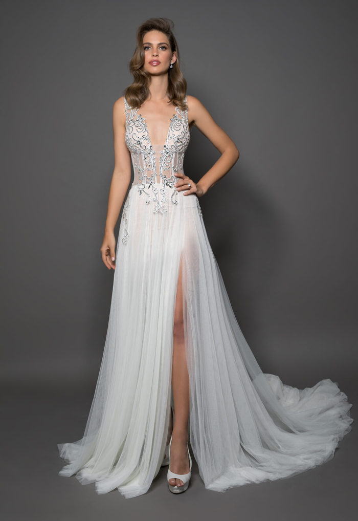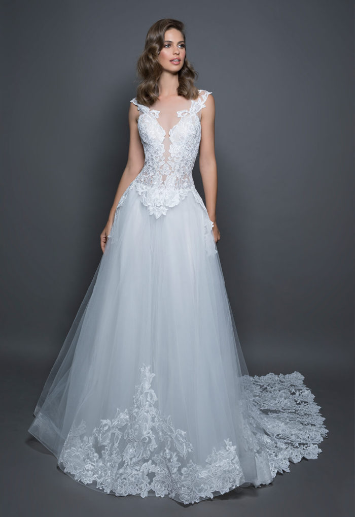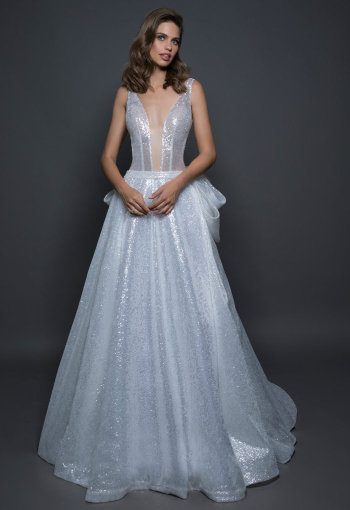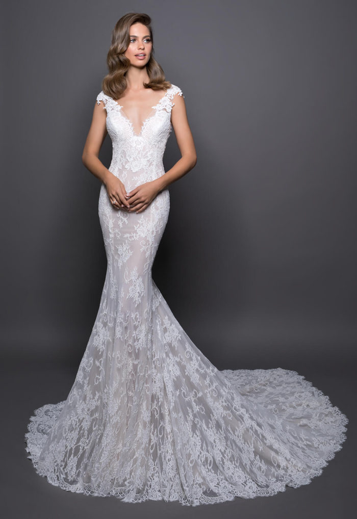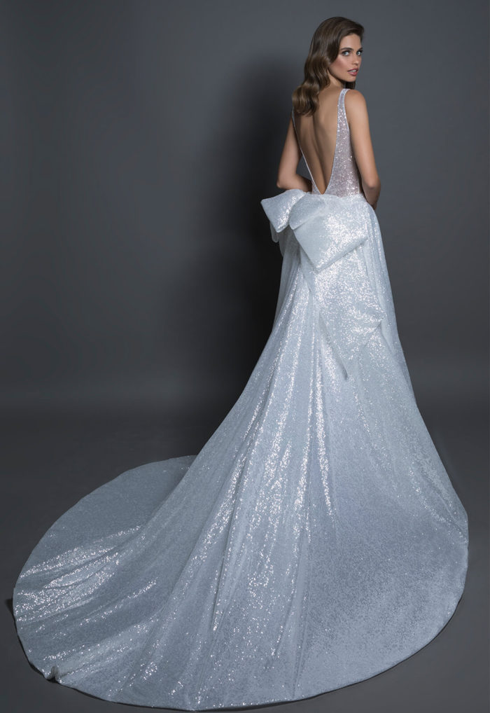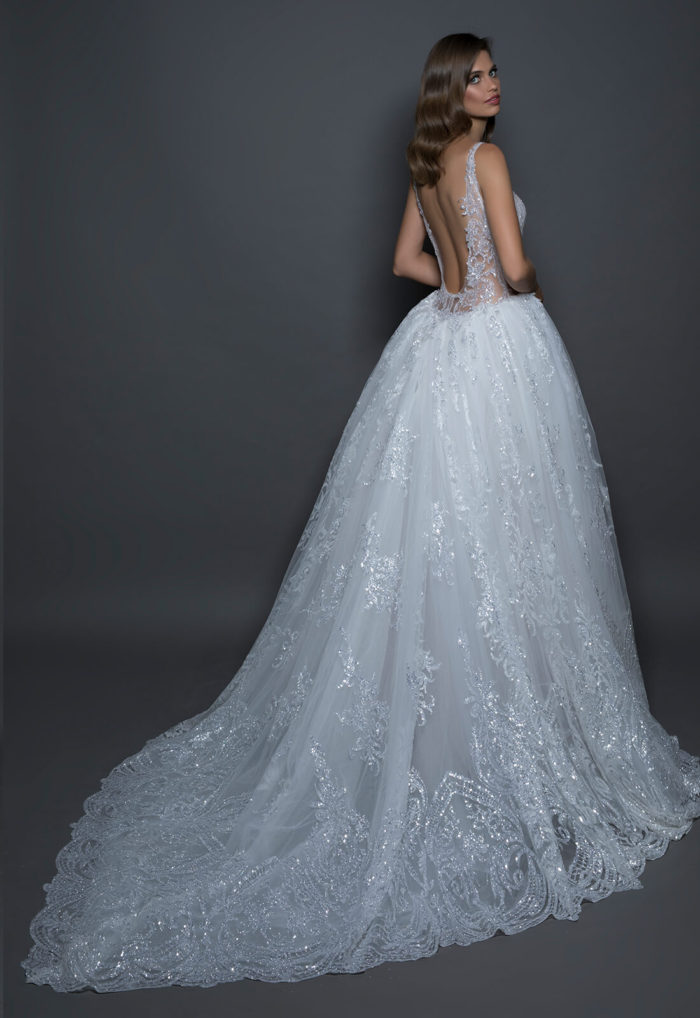 Carezze di tessuti d’alta moda scivolano languide lungo la figura, mentre si avvicendano a sontuosi modelli da principessa e tagli a sirena dalle raffinate e sensuali promesse, in un’eco di esclusiva sartorialità Made in Italy, attraverso un crescendo di ricami e lavorazioni semplicemente splendidi, da cui si evince la cura particolare per il più minimo dei dettagli.