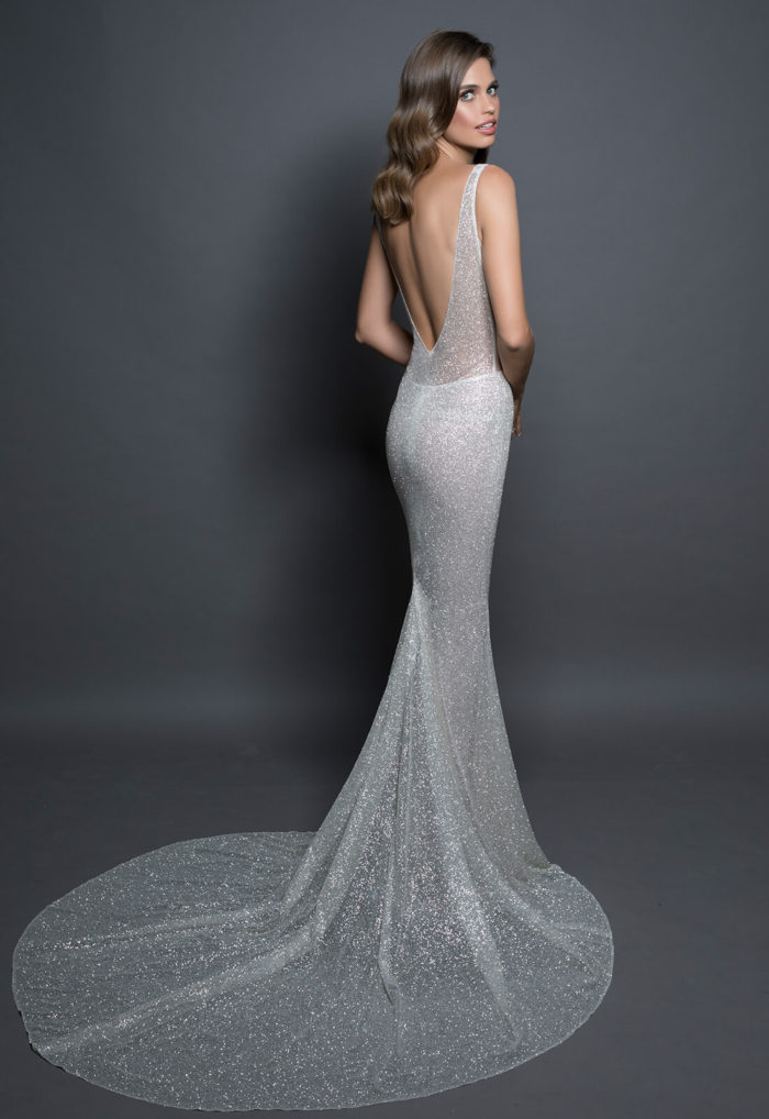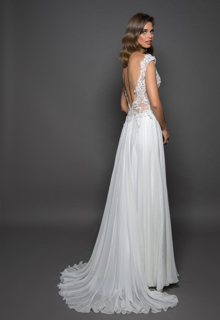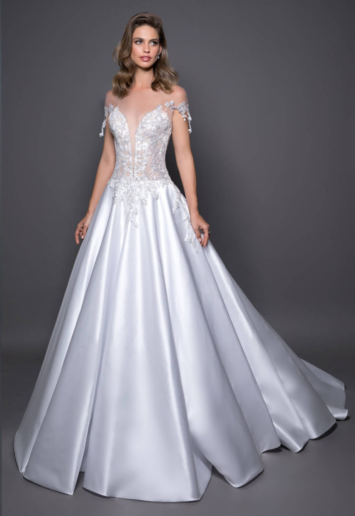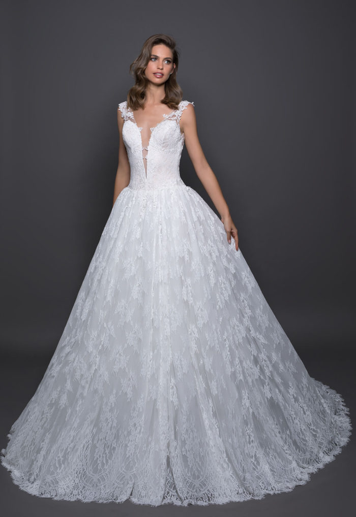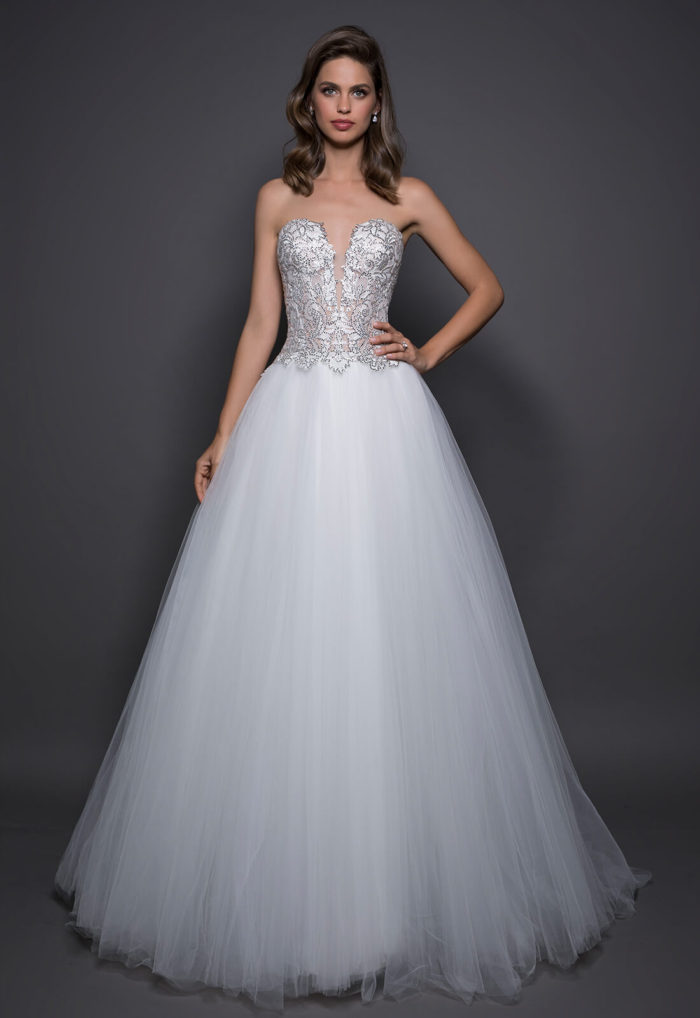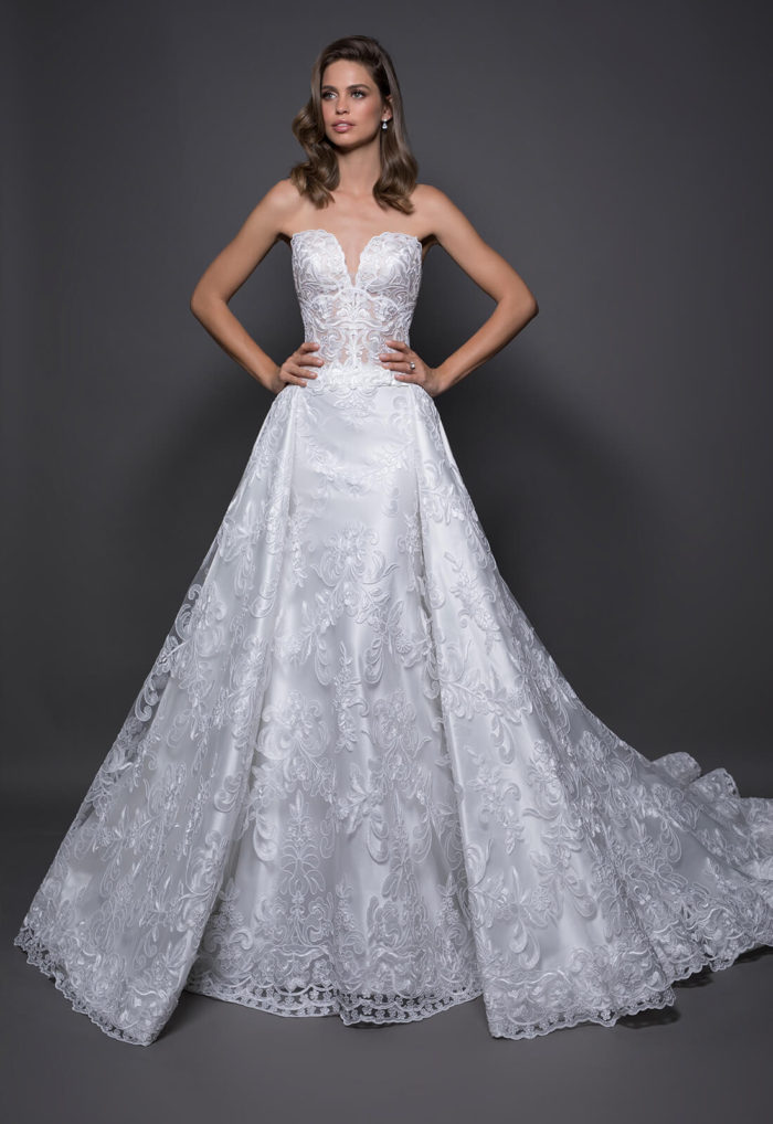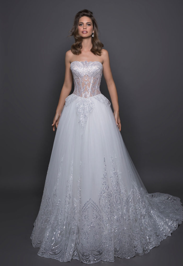 Carezze di tessuti d’alta moda scivolano languide lungo la figura, mentre si avvicendano a sontuosi modelli da principessa e tagli a sirena dalle raffinate e sensuali promesse, in un’eco di esclusiva sartorialità Made in Italy, attraverso un crescendo di ricami e lavorazioni semplicemente splendidi, da cui si evince la cura particolare per il più minimo dei dettagli.