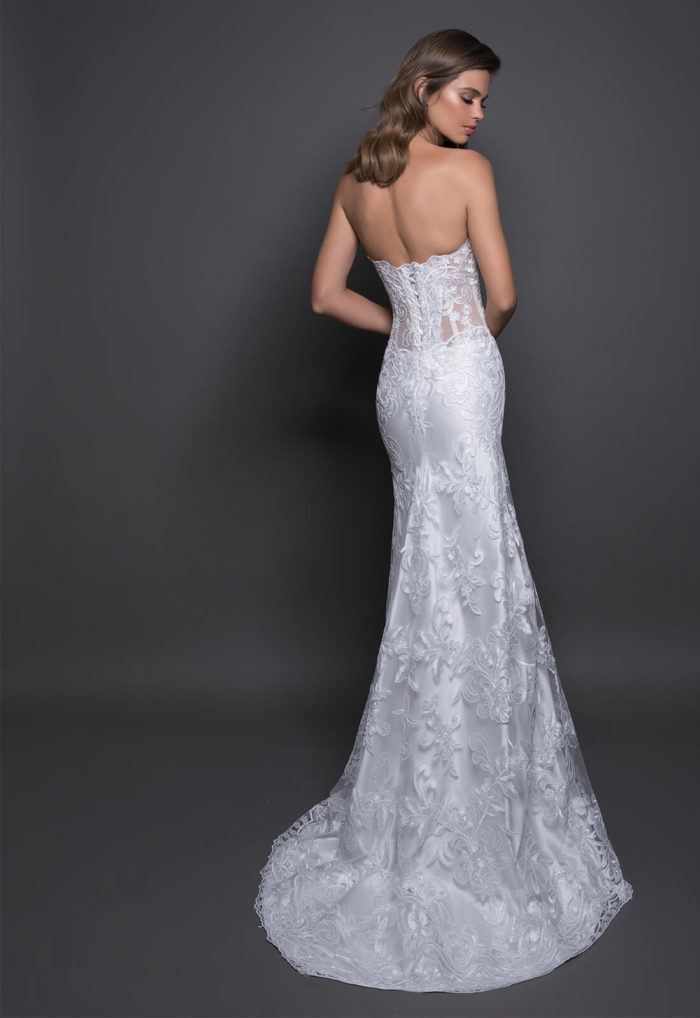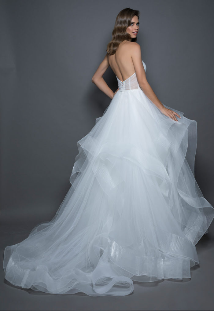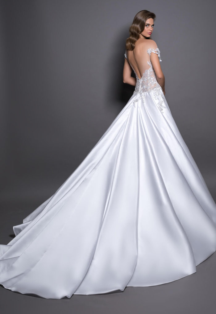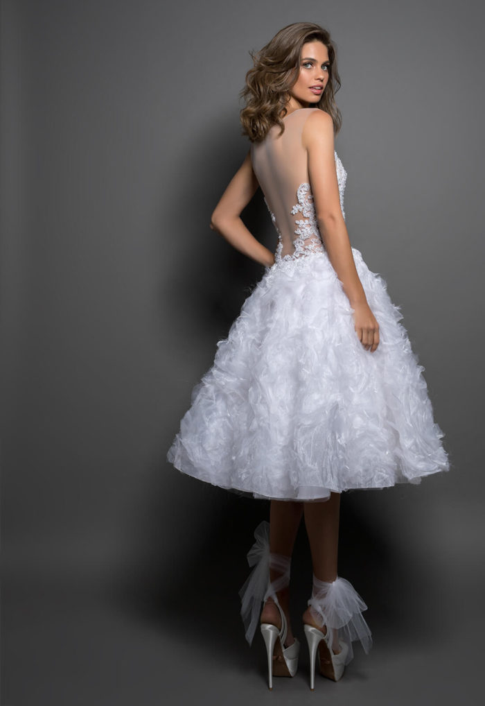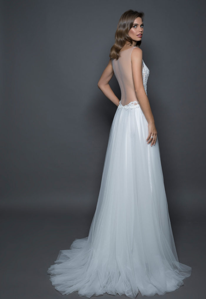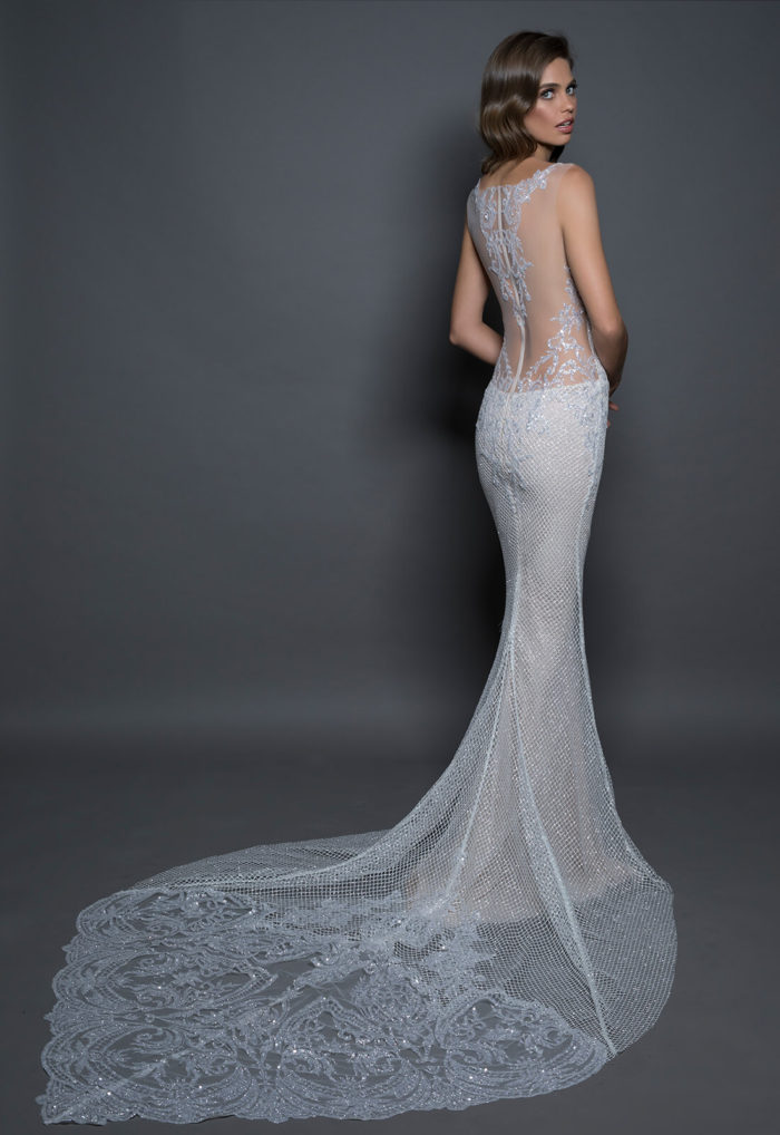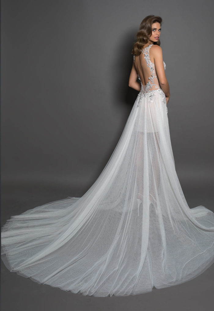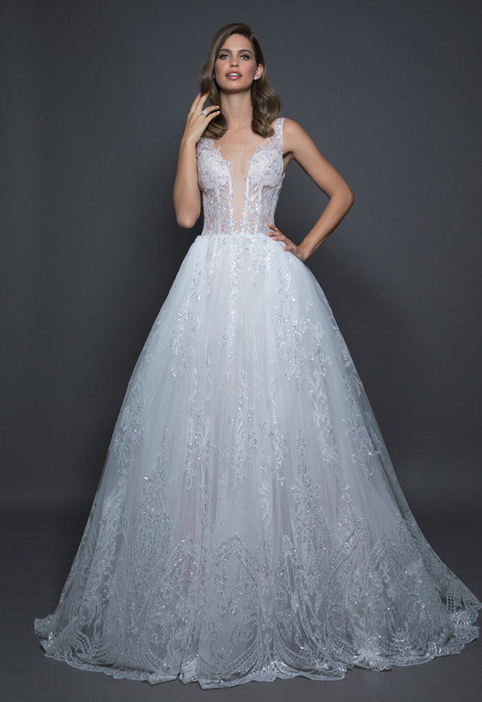 Carezze di tessuti d’alta moda scivolano languide lungo la figura, mentre si avvicendano a sontuosi modelli da principessa e tagli a sirena dalle raffinate e sensuali promesse, in un’eco di esclusiva sartorialità Made in Italy, attraverso un crescendo di ricami e lavorazioni semplicemente splendidi, da cui si evince la cura particolare per il più minimo dei dettagli.