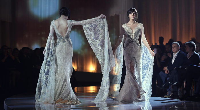 Elie Saab: “La tuta è un signature look in tutte le mie collezioni. Per la sposa, mi piace rivisitare in base al tema. La scorsa primavera, era molto moderna e grafica. Per questa stagione, ho preso spunto da un giardino in piena fioritura quindi ho lavorato con applicazioni di pizzo ed inserti floreali eterei, ricordandomi di petali che cadono dagli alberi in fiore. Il mantello è l’aggiunta di un effetto teatrale alla silhouette”.