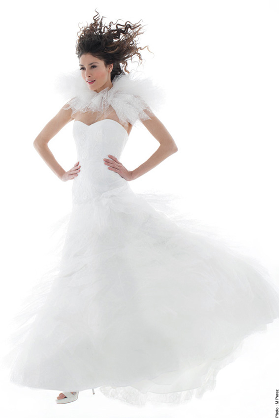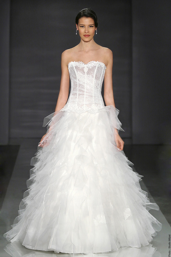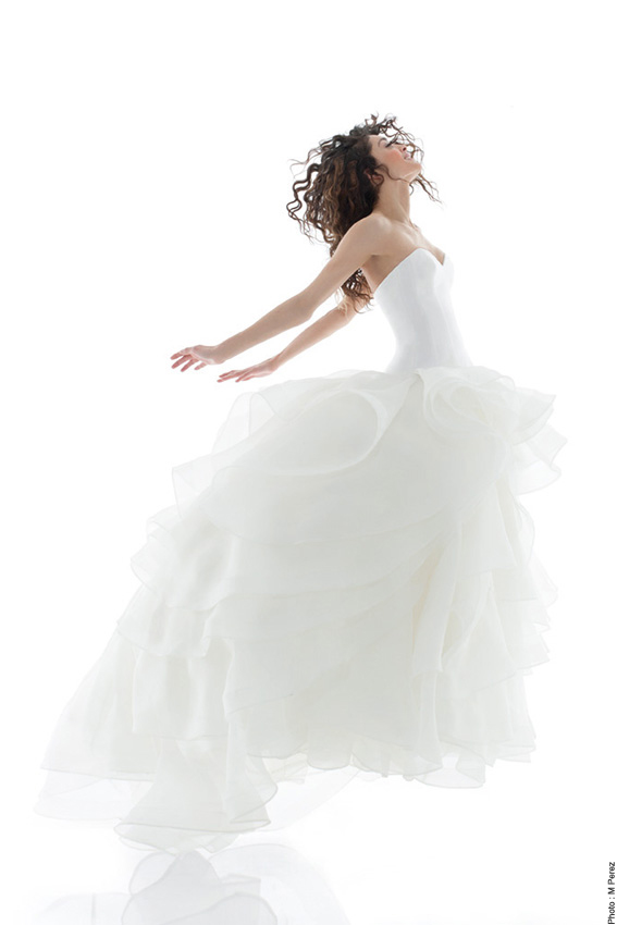 La scelta di tessuti ricercati si rivela perfetta per sottolineare la classe di ogni creazione: sete ed organze pregiate, soavi pizzi (sia Chantilly, sia nella preziosa versione Calais), sono contropartite raffinate di eterei e leggeri tulle, chiffon, taffettà e (per un tocco deliziosamente retrò) piume.