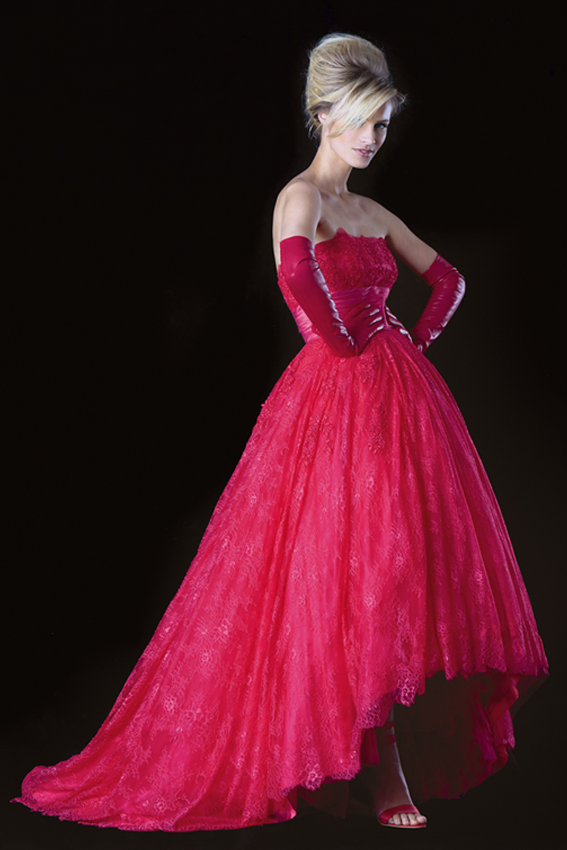 Ecco, allora, l’impiego di tenui sfumature pastello dall’intento rosato, soprattutto dalla tonalità antica, cipria e salmone: ma il desiderio di osare non si placa qui, introducendo un ampio abito asimmetrico di un acceso e provocante rosso, dal risultato finale decisamente accattivante.