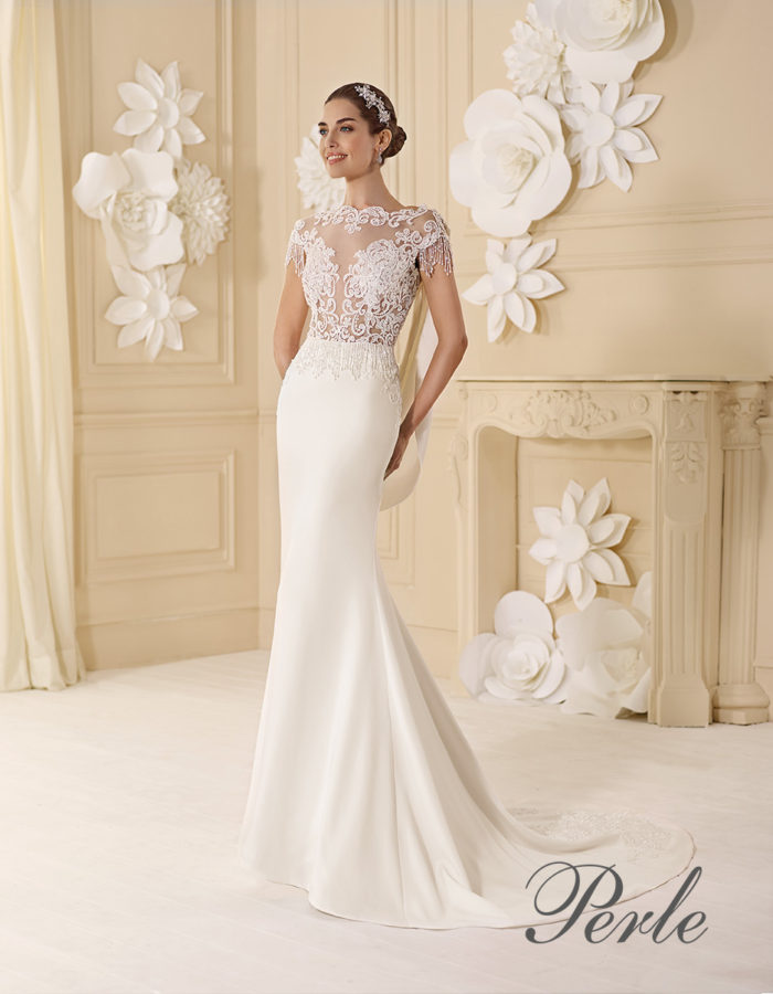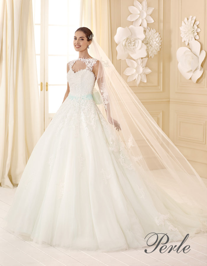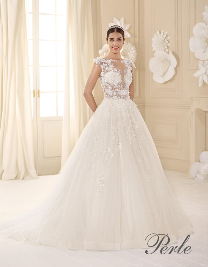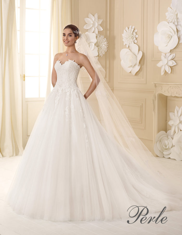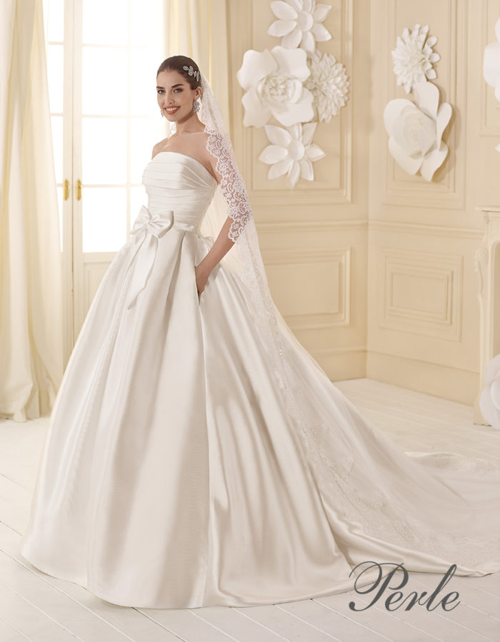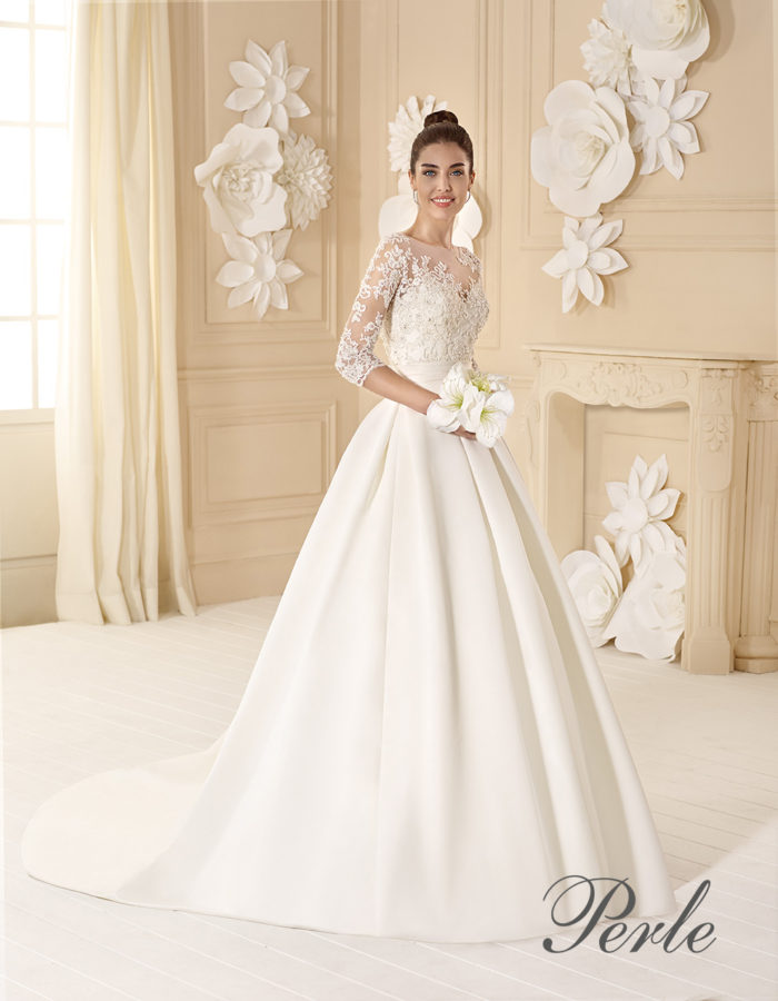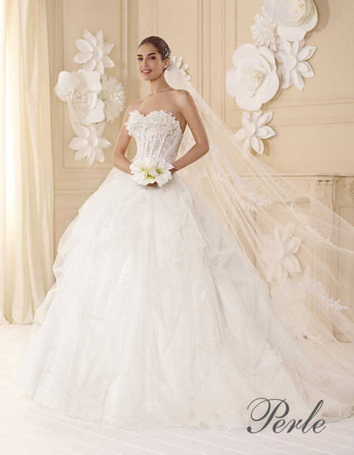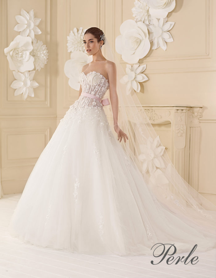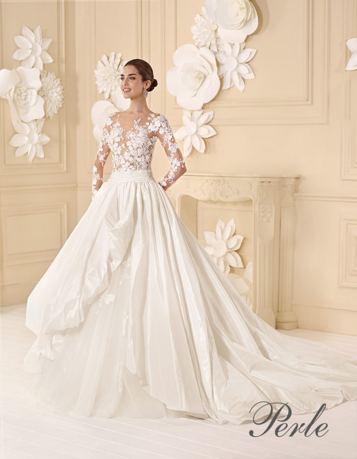 Per gli abiti da sposa Perle 2017 solo la pregiatezza di tessuti preziosi, gemme al tatto ed alla vista, che, dal pizzo al mikado, creano lavorazioni carismatiche, soprattutto per quanto riguarda i principeschi ricami, inconfondibile risultato di pizzi rebrodadi, ricamati a filo e macramè.
