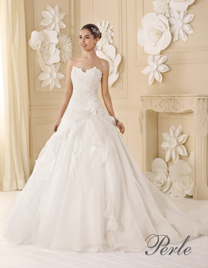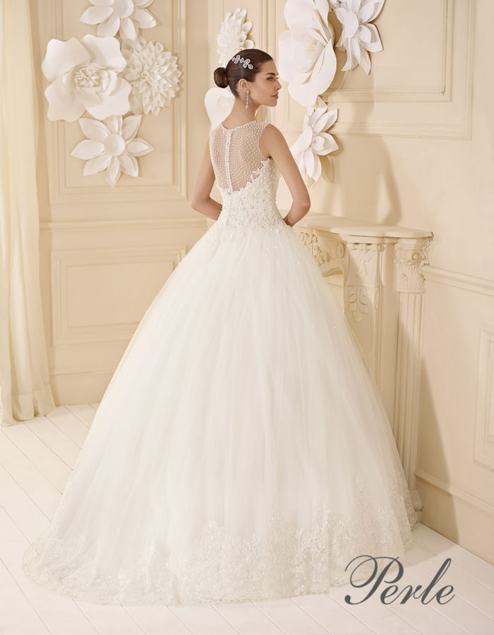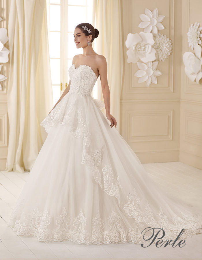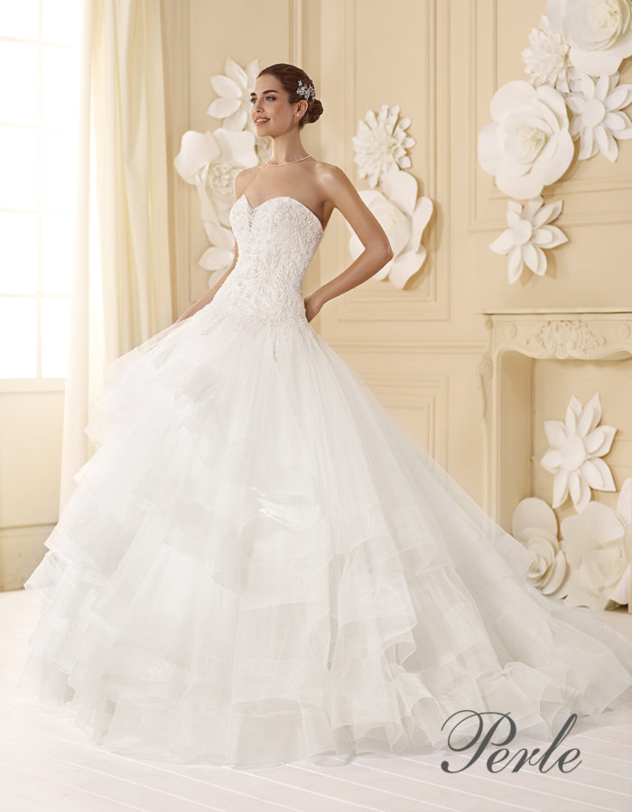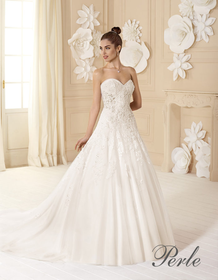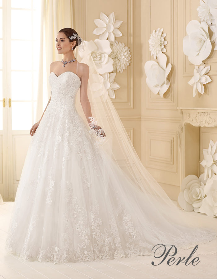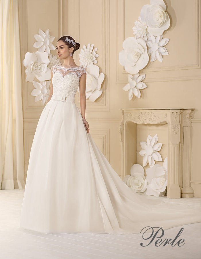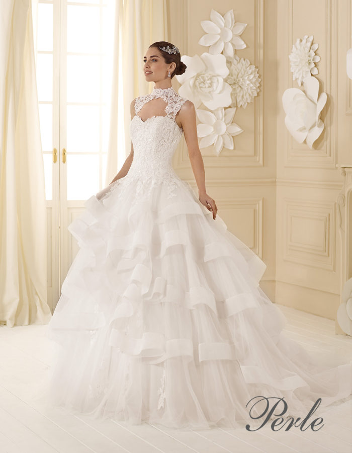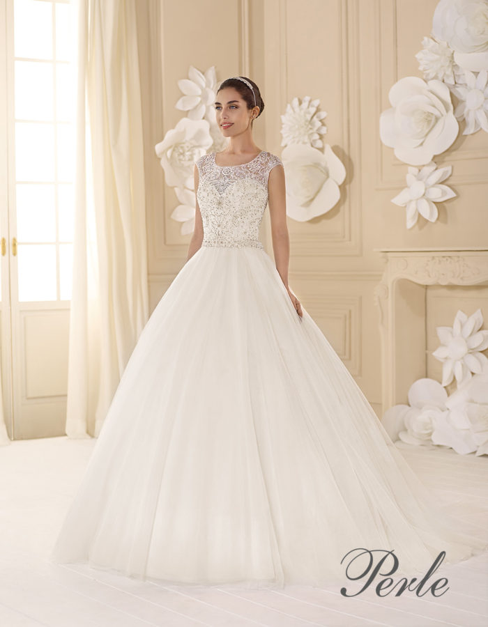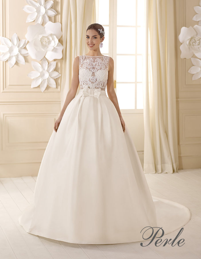 Per gli abiti da sposa Perle 2017 solo la pregiatezza di tessuti preziosi, gemme al tatto ed alla vista, che, dal pizzo al mikado, creano lavorazioni carismatiche, soprattutto per quanto riguarda i principeschi ricami, inconfondibile risultato di pizzi rebrodadi, ricamati a filo e macramè.