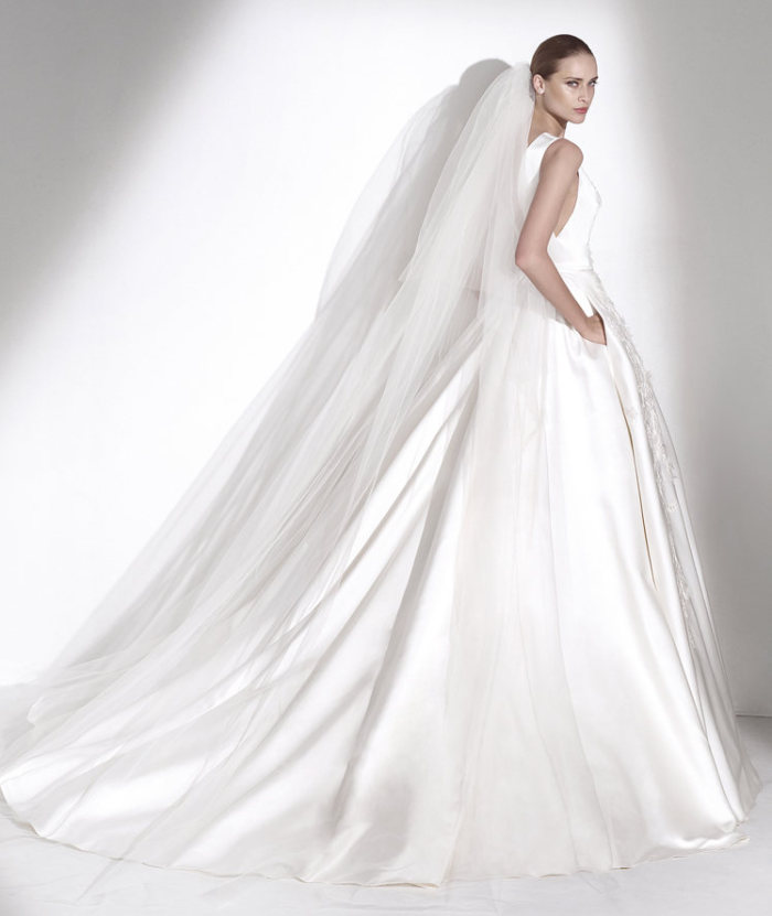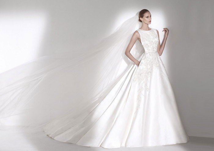 Si comincia, così, dal modello Aldabra, un taglio ampio da principessa (in raso e tulle), che non disdice, tra le pieghe della gonna, la comoda presenza di tasche laterali, mentre un alto scollo a barca accompagna un corpetto, scintillante di pietre preziose e ricami; elegante la sottile cinturina di pelle in vita.