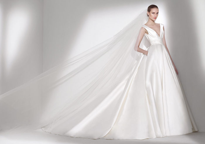 Un po’ stile peplo ed un po’ stile principessa, il modello Calamian è un abito da sposa dallo scollo all’americana, ampio e profondo, perfetto controaltare della scollatura quadrata sulla schiena; è realizzato in mikado, un tessuto ideale per donare un effetto a piega a tutta la voluminosa gonna (accattivante la fascia alta in vita…).
