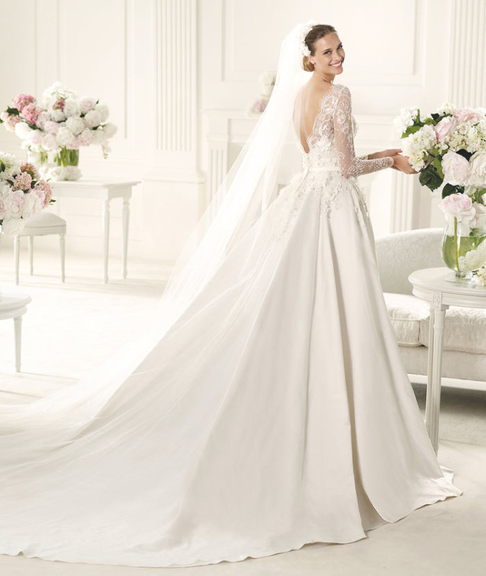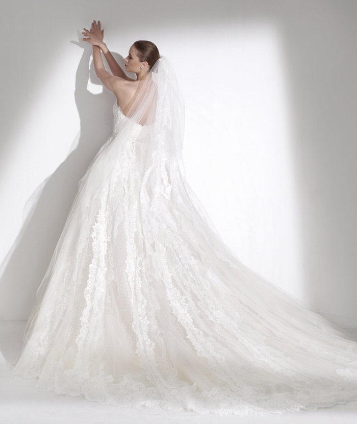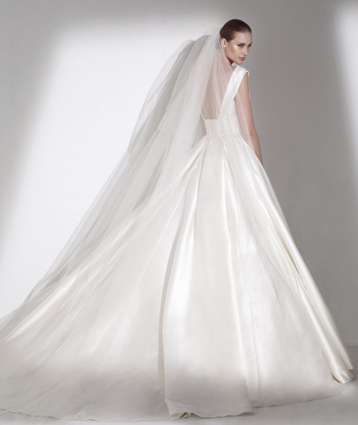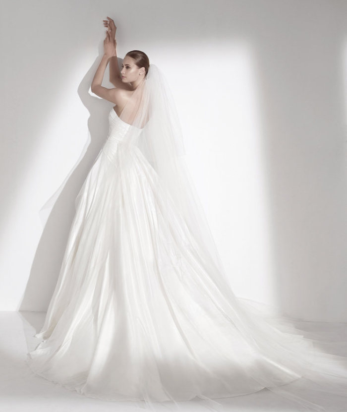 Ed, infine, ancora un taglio svasato per l’ultimo abito da sposa 2015, ossia il modello Seychelles, dove un sapiente impiego di taffettà drappeggia un ricamo importante tra il corpetto (dallo scollo omerale e senza spalline) e la gonna dall’ineccepibile volume.