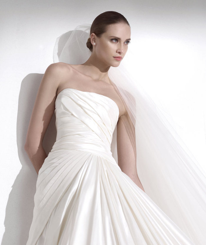 Non poteva mancare il vestito senza spalline, ripreso e rivisitato nell’abito da sposa Kauai, un modello ball gown dalla gonna ampia e vaporosa e dal corpetto con scollo a cuore omerale.