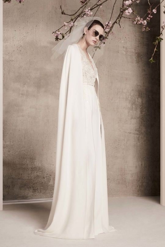 Elie Saab, perciò, ha condotto questa idea di comodità e versatilità su una jumpsuit nuziale con maniche lunghe, la quale ha adottato un approccio intrigante, dai teneri riflessi dei cristalli impiegati.