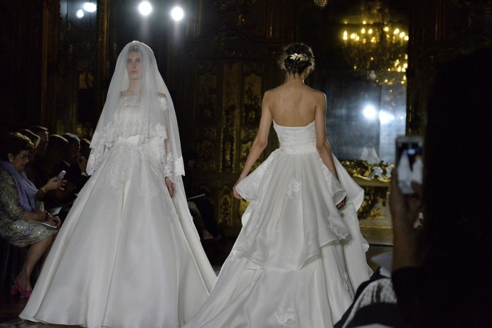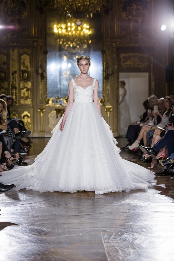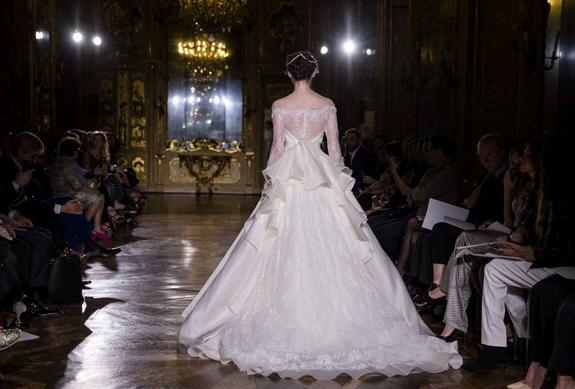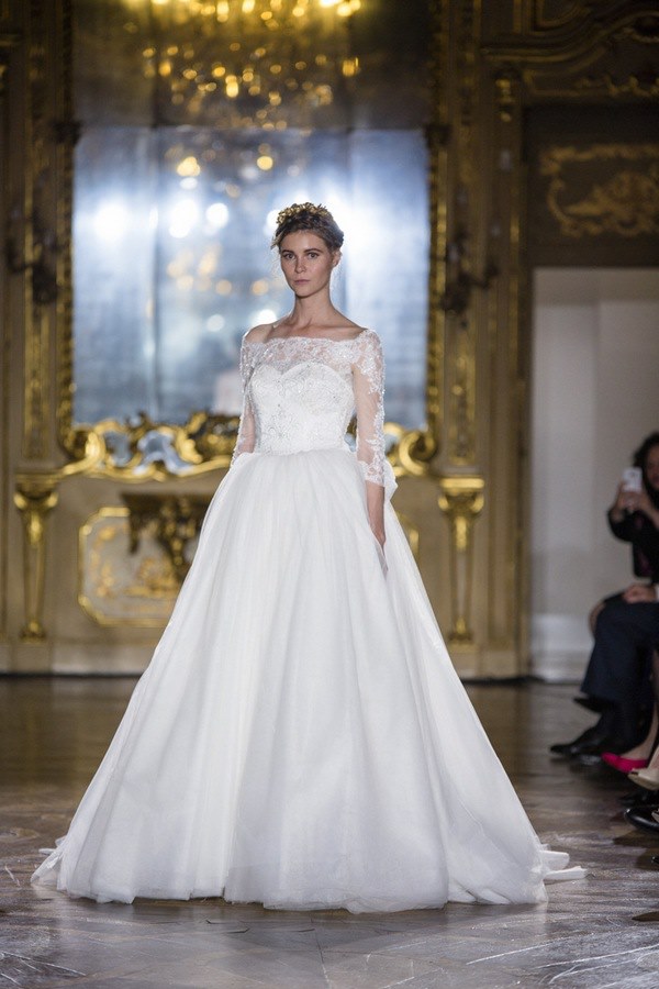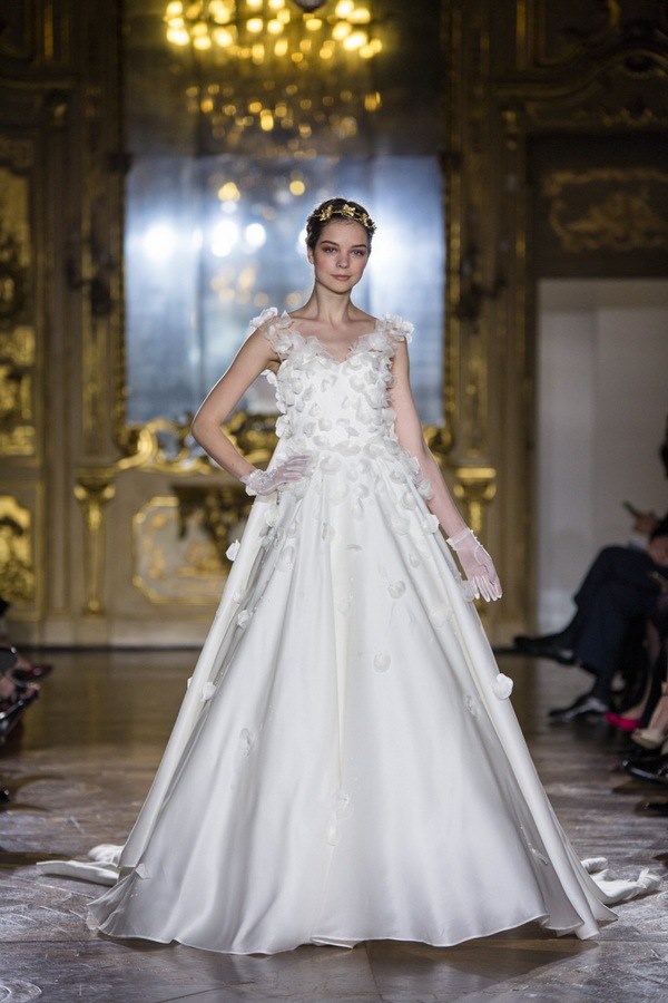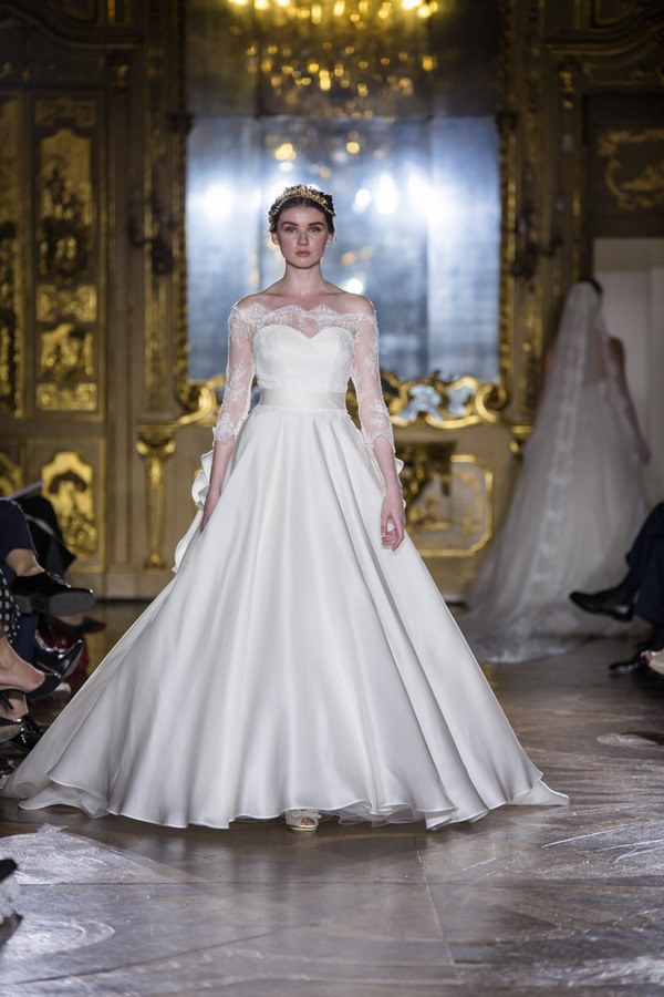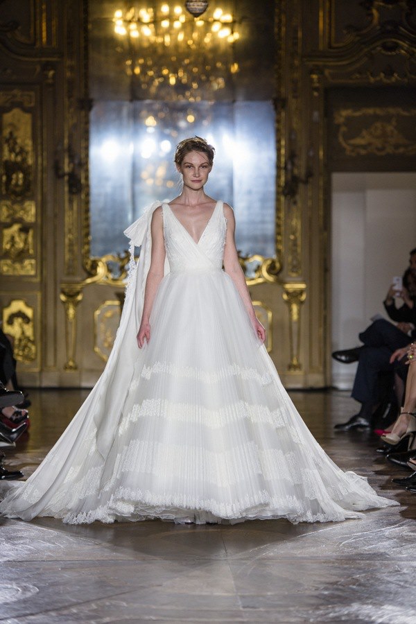Ecco, quindi, un sapiente impiego di tessuti preziosi, che creano gonne lussuosamente voluminose, in mikado di seta per le opzioni più strutturate oppure in tulle ed organza per creare effetti vaporosi ed eterei, in un crescendo di movimenti e curve, dovuti alla deliziosa scelta di profili doppiati.