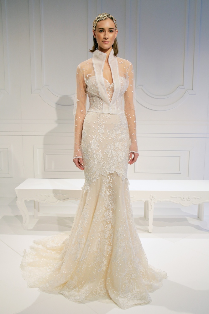 I ricami, le applicazioni e ogni dettaglio impiegato presenta una cura minuziosa dei singoli particolari: cristalli, pizzi e perline creano soavi lavorazioni, in un ricercato ton sur ton dalle algide sfumature, ideale per osare elegantemente con appropriati vedo e non vedo e seducenti effetti tattoo.