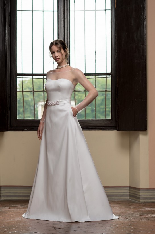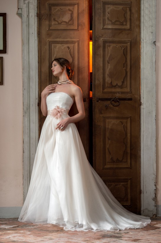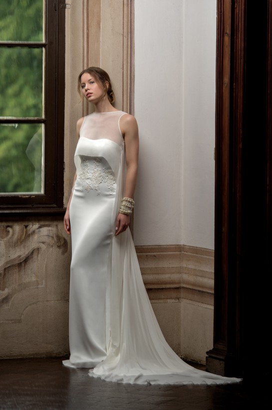 La sovrabbondanza di eleborazioni e dettagli lascia spazio ad una raffinata semplcità, ove, dismesse perpetue sovrastutture di lavorazioni, si ammira la bellezza di un abito da sposa in tutta la sua purezza.