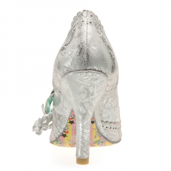 Ovviamente, il tacco raggiunge un’altezza pù moderna (intorno ai 10 centimetri, per intenderci), mentre le lattee applicazioni floreali sulla punta spiccano coordinatamente alla sfumatura argentea del modello.