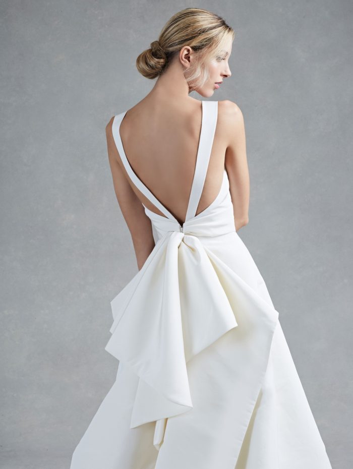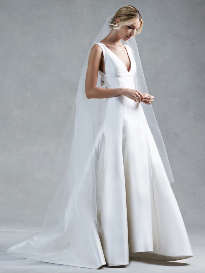 Infine, un rimembrare dallo charme regale in mikado di seta, con l’abito da sposa che ricorda quello sfoggiato da Charléne di Monaco: splendido il davanti sobrio, che fa da contraltare ad un B-side semplicemente spettacolare.