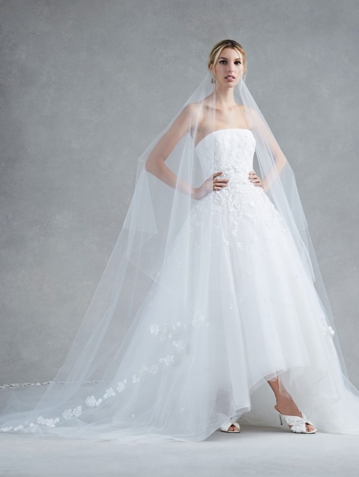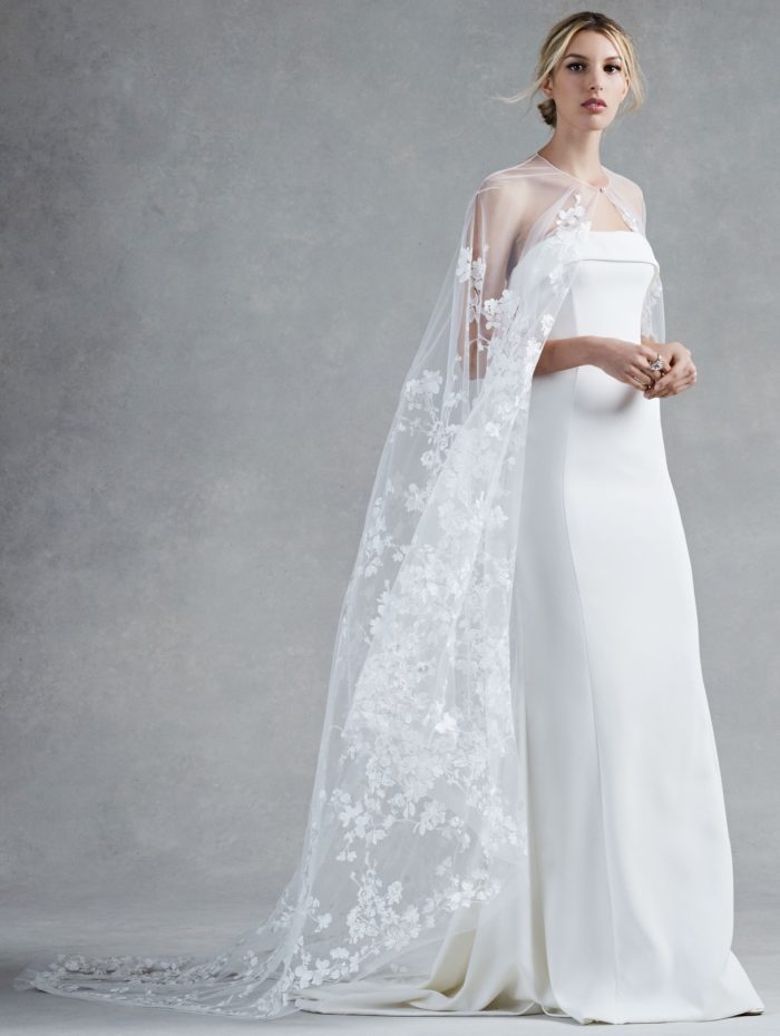 Il taglio a colonna si esplica in una lussuosa linea dritta in georgette, sempre un modello strapless che si abbina alla raffinata scelta della cappa in tulle.