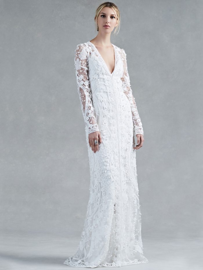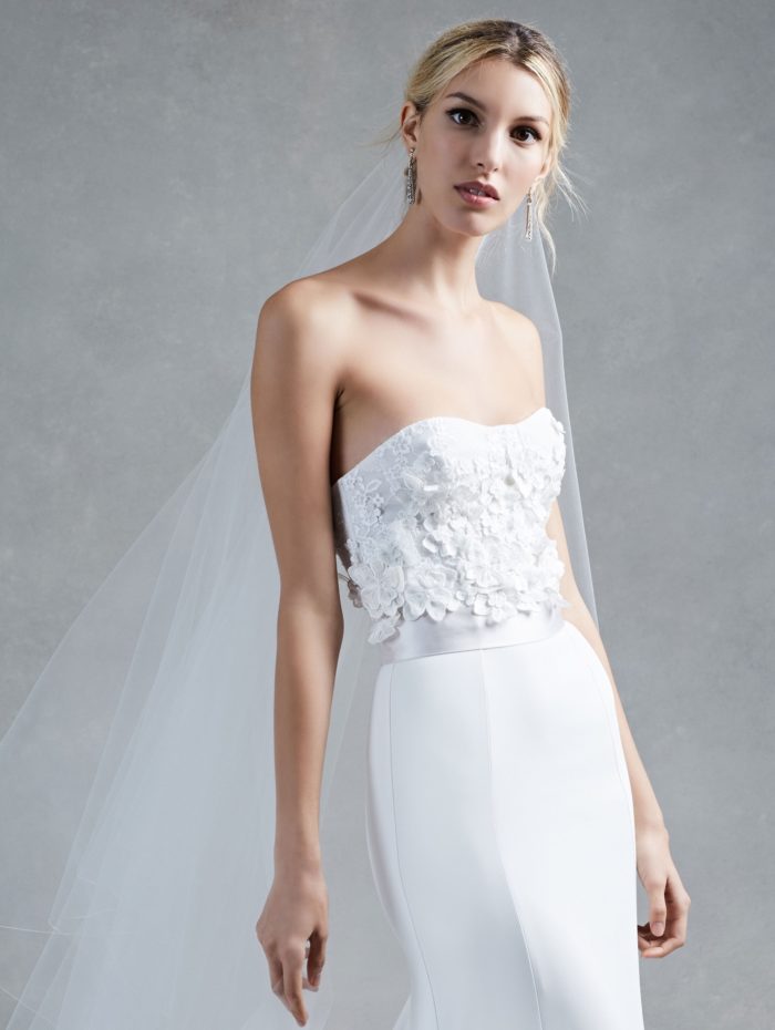 E’ il momento dei mermaid dress, seducenti abiti a sirena, nelle varianti in taffettà e pizzo con maniche lunghe oppure bustier dallo scollo a cuore e gonna in georgette di seta, caratterizzato appunto, da delicate applicazioni floreali in tulle.