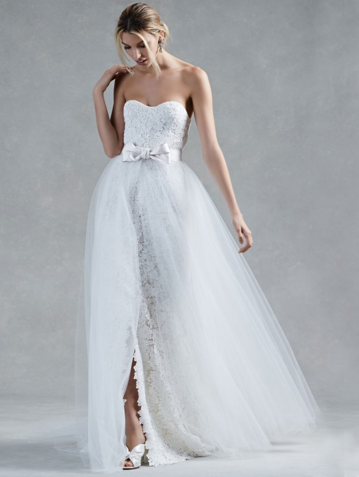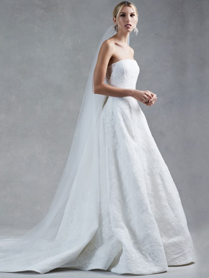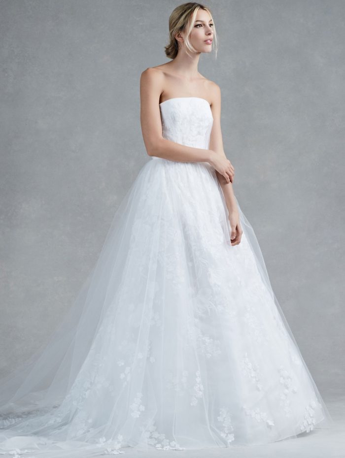 Ecco, quindi, che non possono mancare abiti da principessa ampi e moderni in seta mikado e pizzo, tra cui si ammira il modello con gonna in tulle sovrapposto.