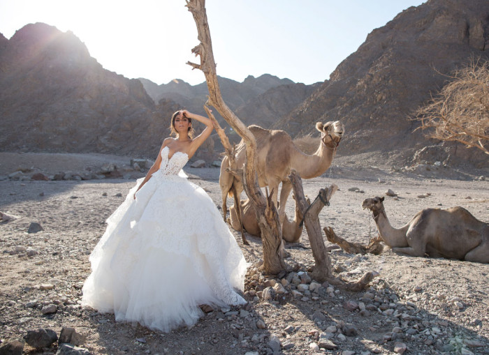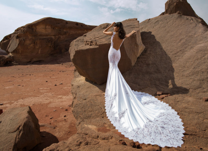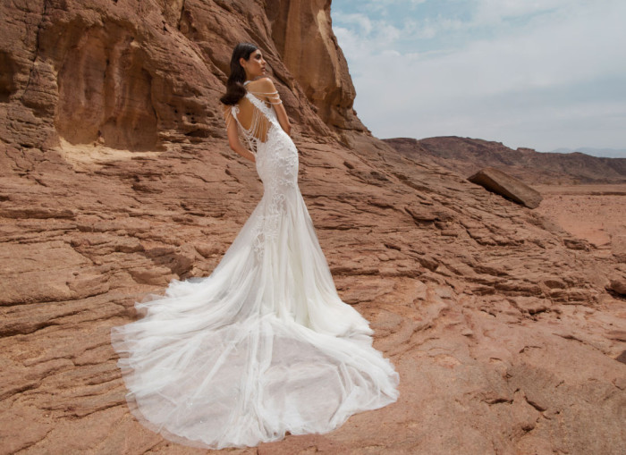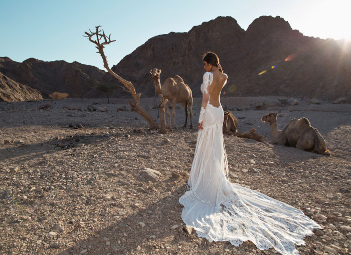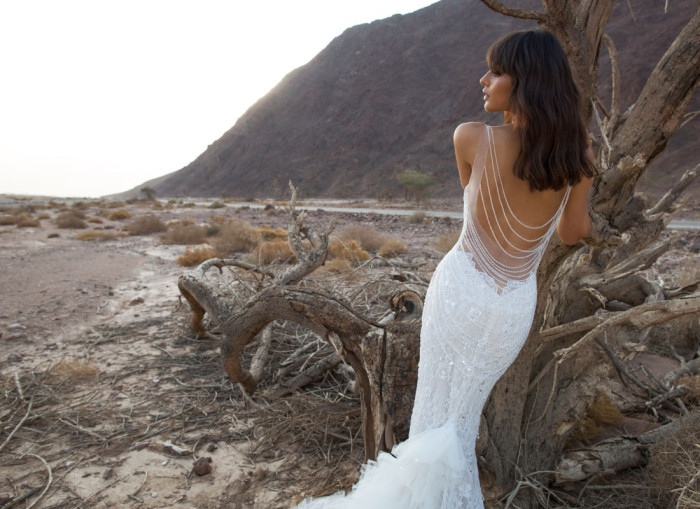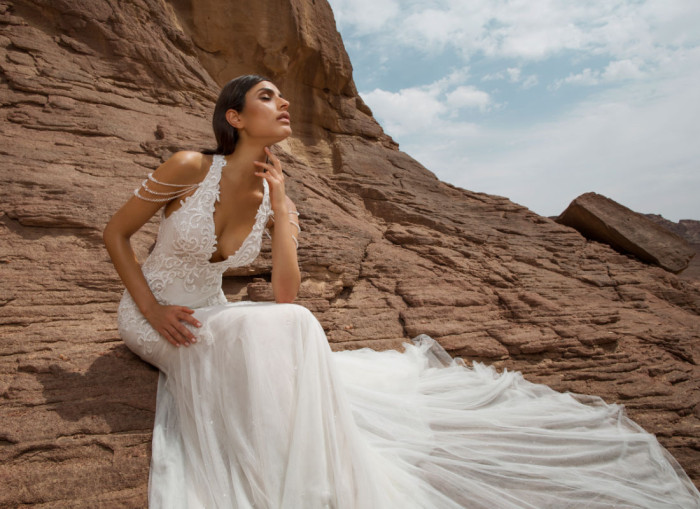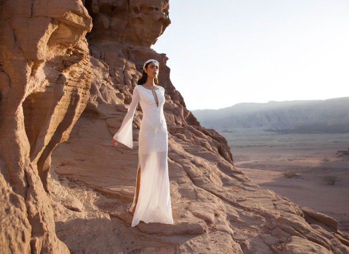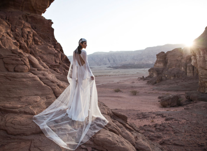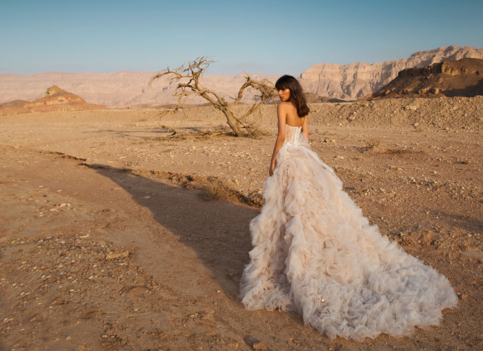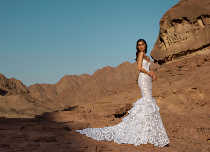 Il lookbook della collezione è stato realizzato con il deserto a fare da sfondo: infatti, ogni vestito da sposa è un inno all’acqua, soprattutto nelle sue increspature intrecciate con vento e sabbia, a creare energia e spirito.