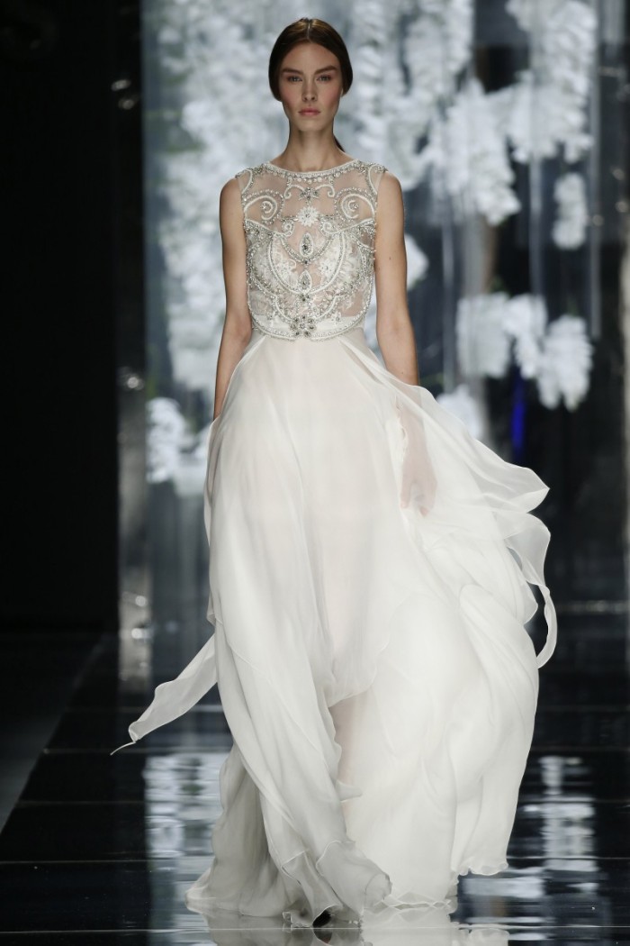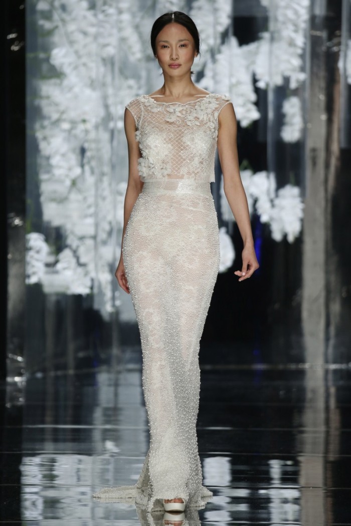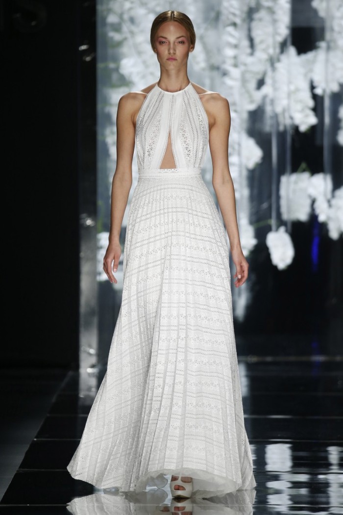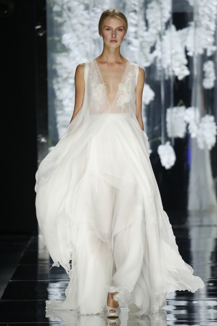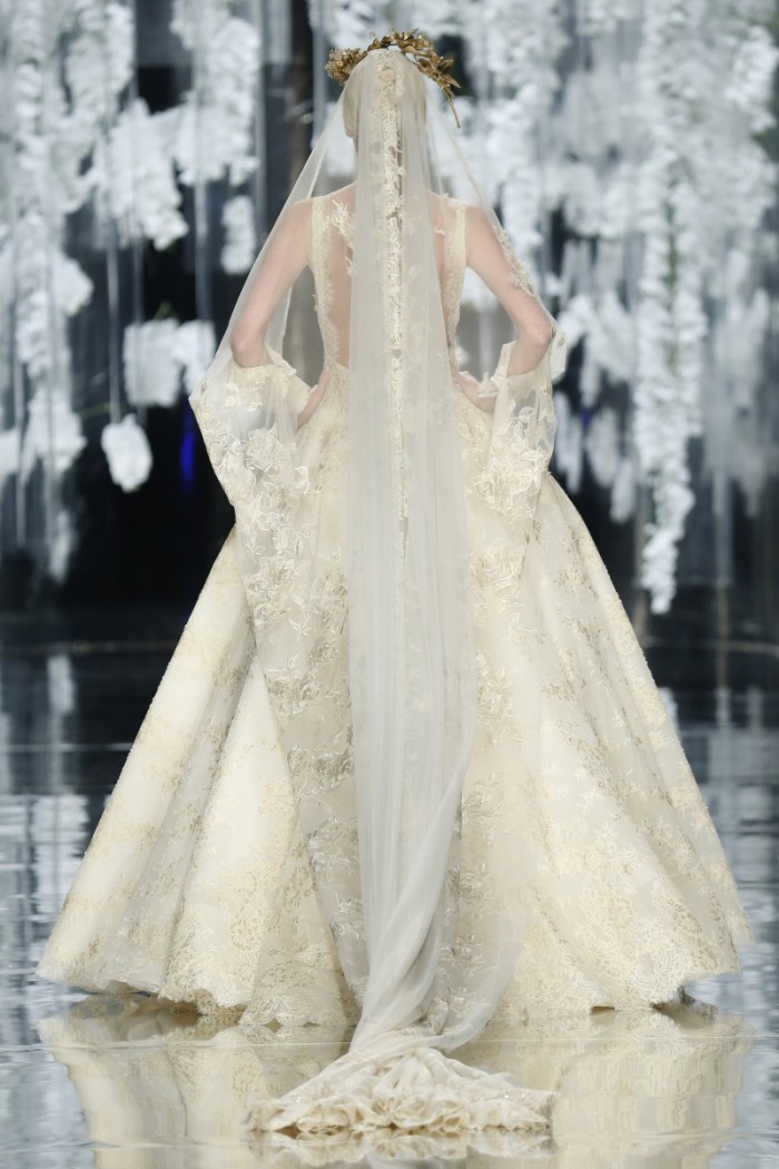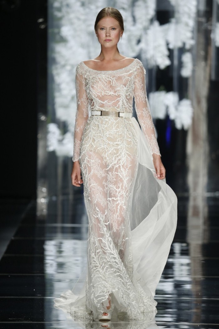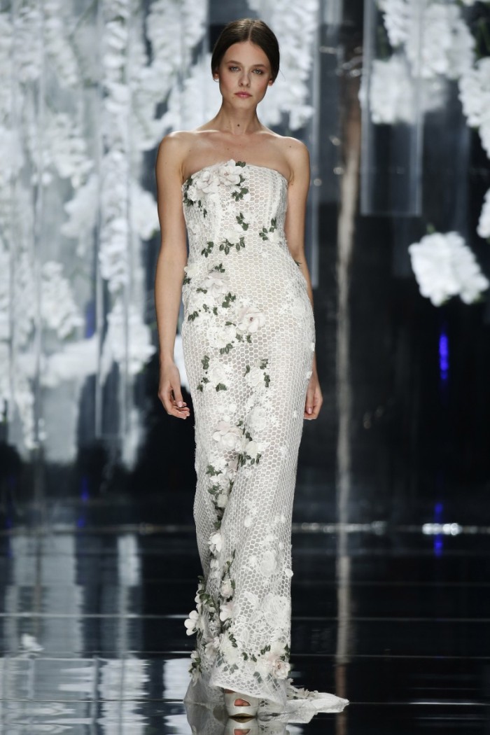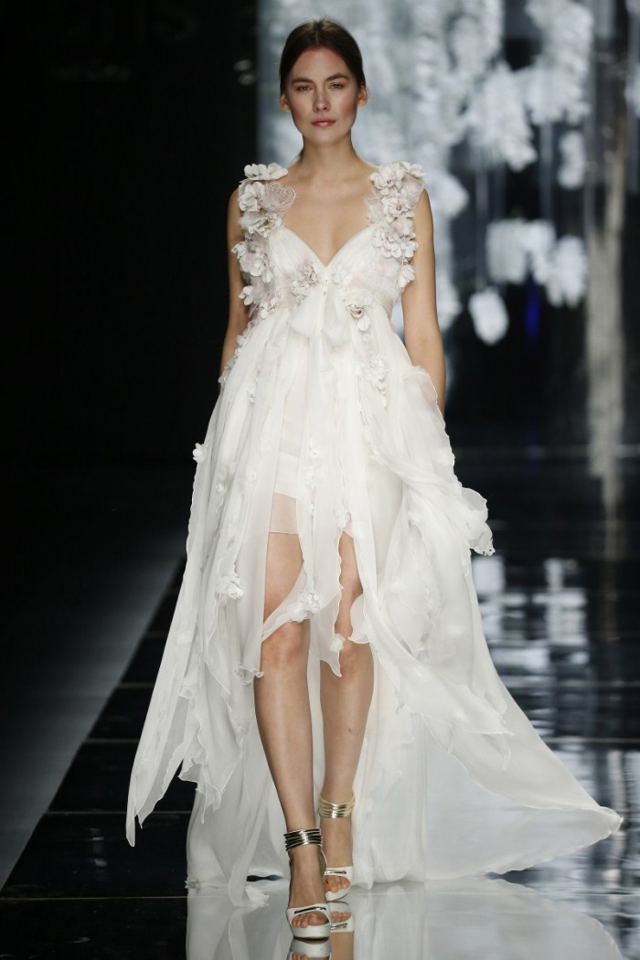 Se da una parte seta, tulle, raso, pizzo etc. confermano la tradizionalità wedding, dall’altra si ammira l’impiego di materiali innovativi con intriganti motivi in filati di cotone od in broccato, magari abbinati a sfumature eteree non solo dal candore eburneo, ma dagli intensi riflessi argentei, dorati, moharé dovuti all’accurata selezione di idonee applicazioni (dagli strass ai cristalli od alle piume, passando per tessuti dipinti a mano).