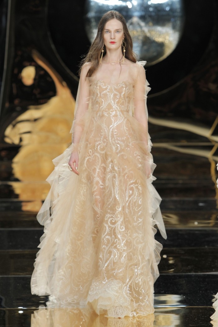Ecco, quindi, camicette trasparenti, corsetti e stecche in bella vista alternarsi a lussuosi effetti see trought, impiegando la naturale evanescenza del tulle e la pregiatezza del pizzo Chatilly, magari abbinati alla serica essenza della seta e dell’organza ed alla ricca implementazione di piume, argento, oro e pietre preziose a formare elaborati ricami floreali.