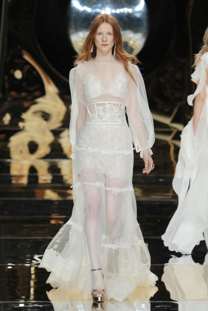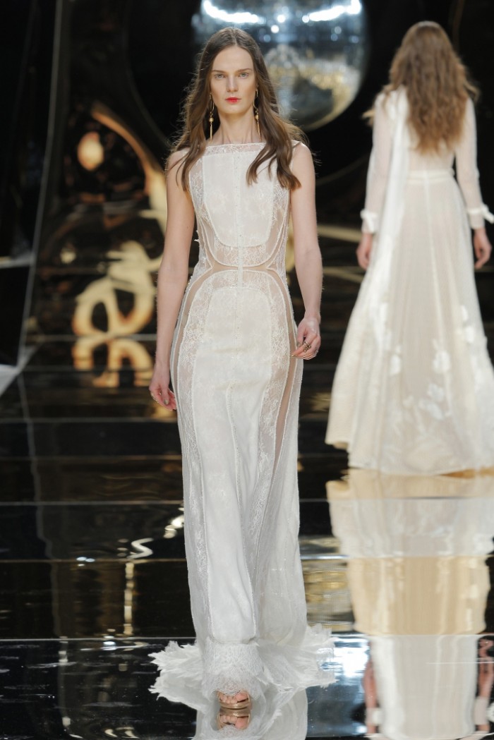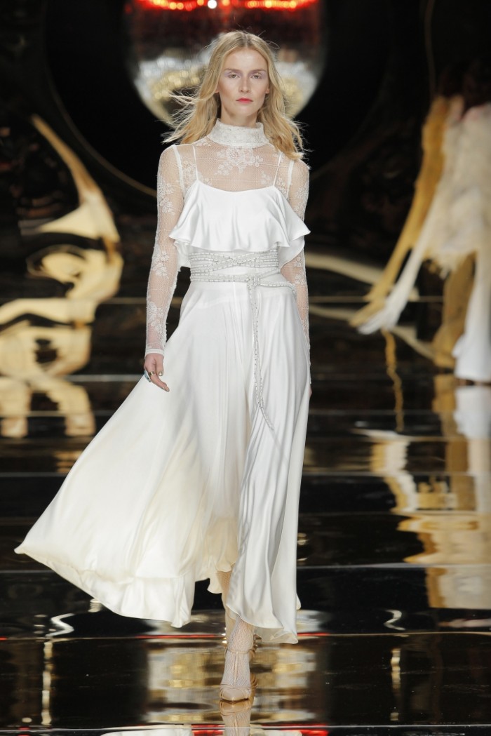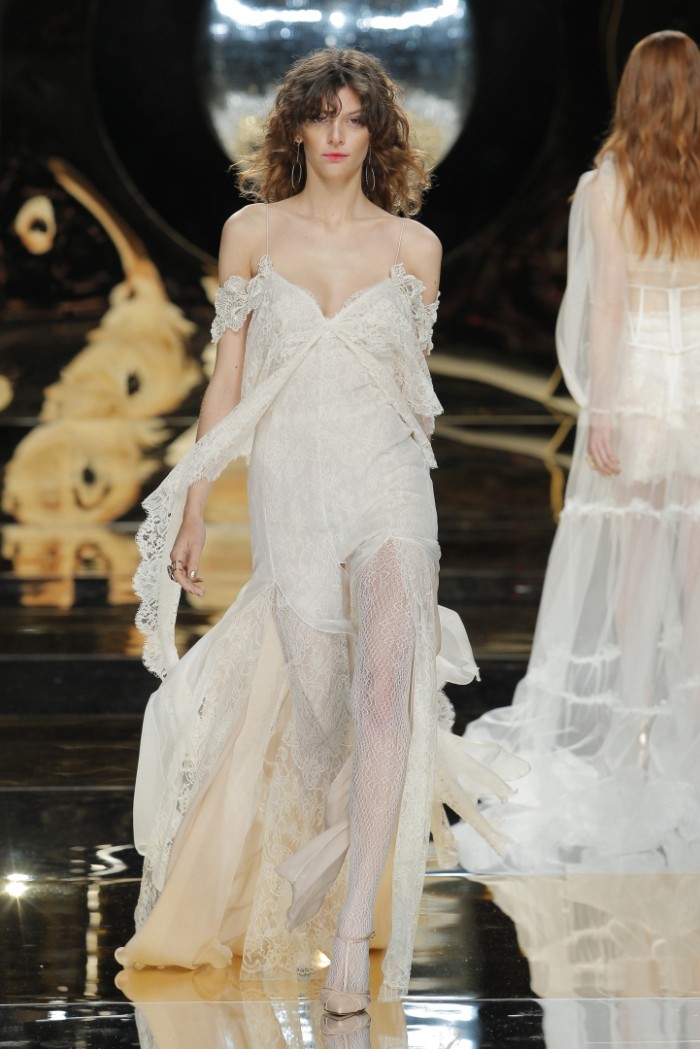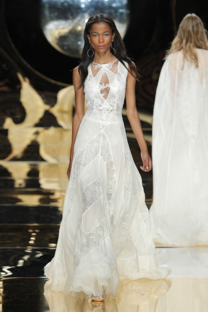 Infatti, si ammirano vestiti da sposa che ricordano i fasti hippie e bohemien degli anni Settanta, realizzando un accattivante countdown di modelli che riflettono i canoni caratterizzanti del periodo.