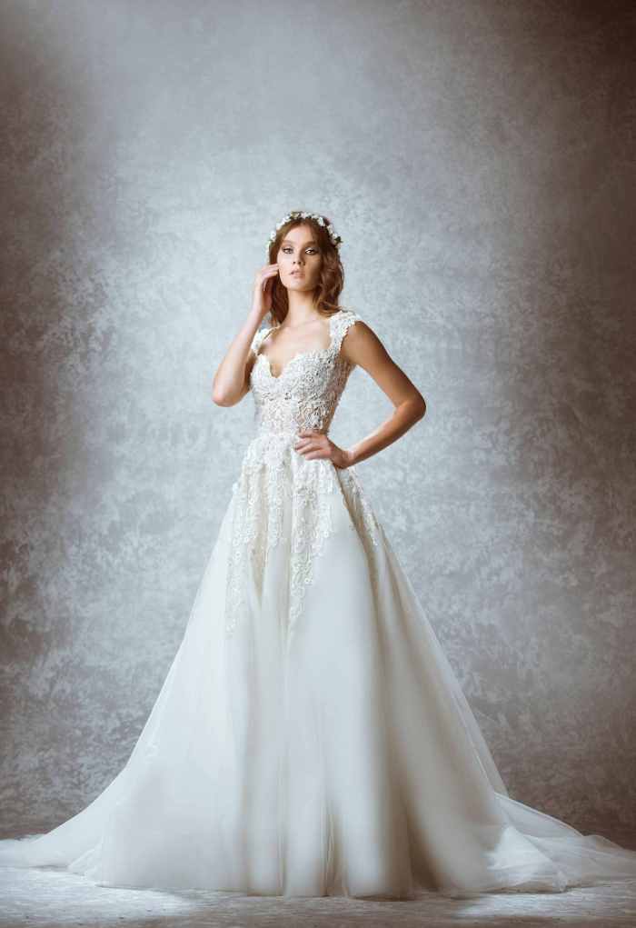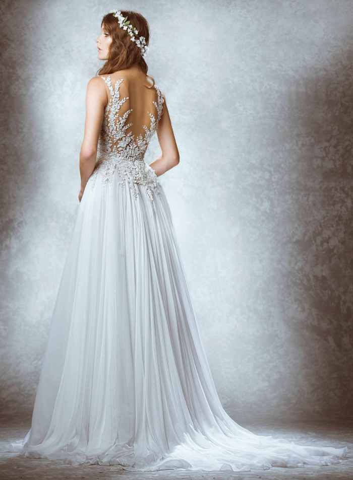 Infatti, l’evanescenza del tulle si rivela una squisita soluzione per farvi scorrere splendide ramificazioni di pizzo ricamato, quasi fossero una seconda pelle, pronte a velare (oppure svelare…) le dolci curve di una silhouette femminile.